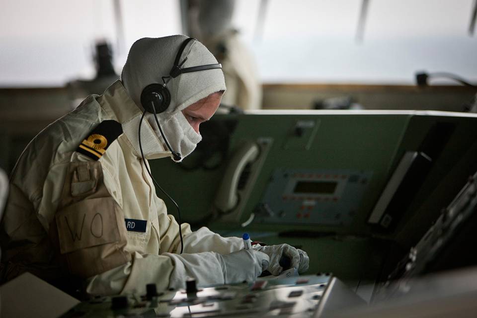Gekleed in de witte anti flash-uitrusting moet de bemanning zich weren
