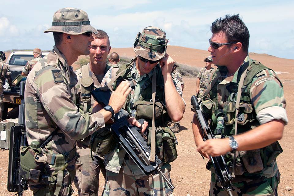 Afgelopen maand voer het Franse transportschip Dumont d’Urville Curaçao binnen. Aan boord een compagnie militairen uit Martinique en Frans Guyana die twee weken lang intensief trainden met Nederlandse mariniers, landmachters en de Curaçaose Militie. “Het is goed dat we elkaar op deze manier beter leren kennen en elkaars taal leren spreken”, concludeert commandeur Lodder. “Tenslotte zijn we belangrijke partners en treffen we elkaar ook regelmatig in heel andere omstandigheden.”