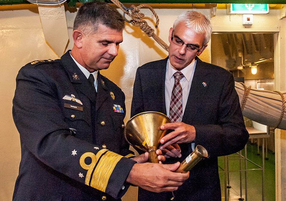 Henk Bussemaker (rechts zittend) luistert aandachtig naar de toespraak van de directeur Marinemuseum, KLTZ (SD) Harry de Bles.