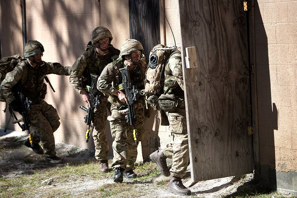 De eerste salvo’s klinken. De kakofonie van kleinkaliberwapens vanuit het oefendorp krijgt repliek uit de bosrand. Zware machinegeweren bestoken de terroristische posities. Twee Nederlandse Mercedes Benz terreinwagens nemen positie in aan de rand van het dorp. Mariniers stijgen uit en openen het vuur. Terwijl zich rondom de MB een berg .50-hulzen vormt, stormen Britse mariniers en Canadese en Noorse landmachtmilitairen naar voren.