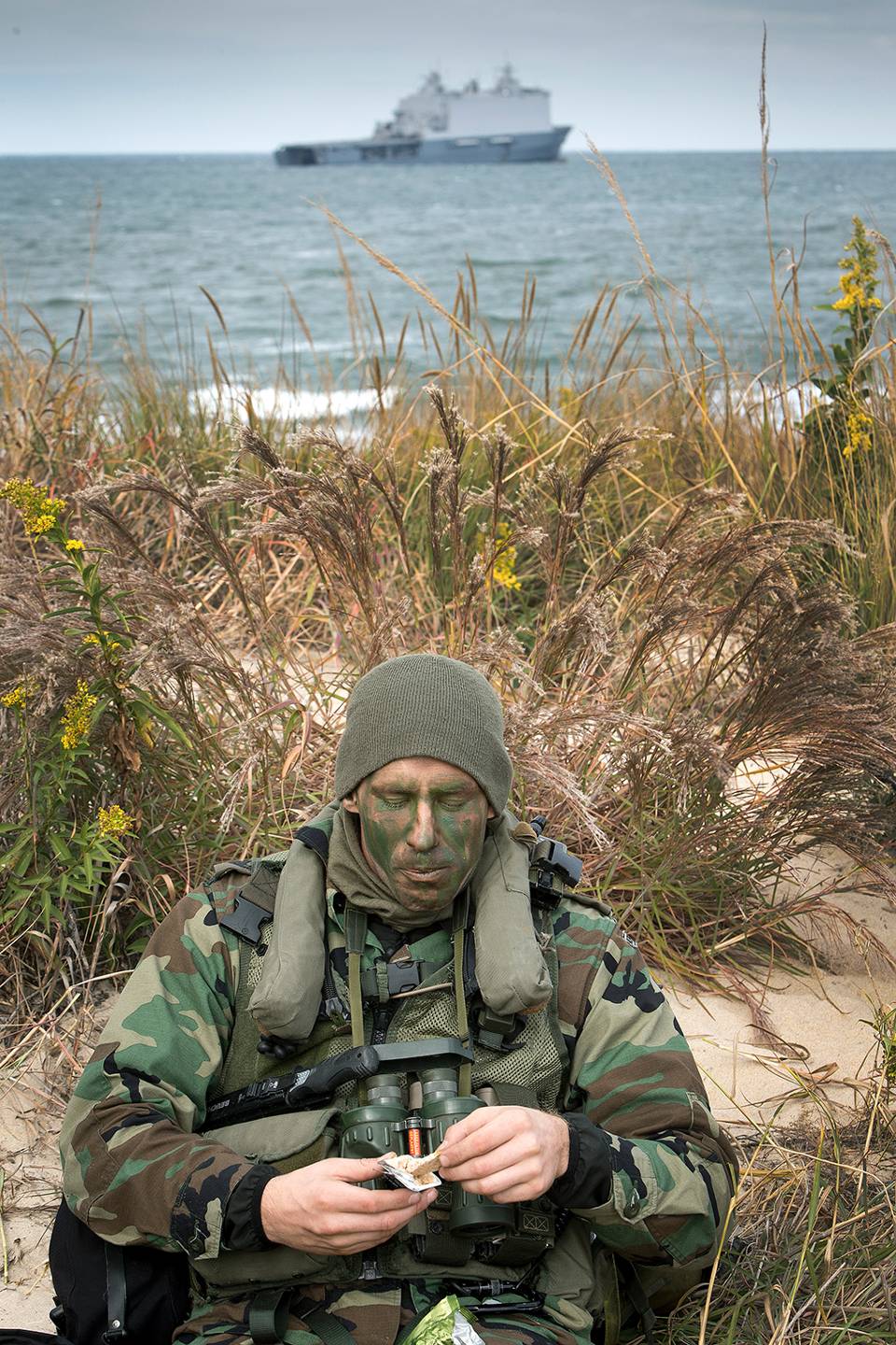 “De staf werkt volledig geïntegreerd samen”, vertelt Kramer. “We stemmen alle operaties goed op elkaar af om een maximaal effect te bereiken, zowel op zee als op land.” Majoor der mariniers Ron Schepel ziet dat vanuit zijn rol als evaluator van de oefening ook terug. “‘Blauw’ (de vloot –red.) en ‘groen’ (de mariniers –red.) zijn in het planningsproces in elkaar geschoven”, legt hij uit. “Daardoor kun je sneller de verschillende stappen in een militaire operatie doorlopen: plan, do, check, act. Het is net als boksen: je moet altijd je tegenstander een stap voor zien te blijven. Als hij knippert, kun jij toeslaan.”