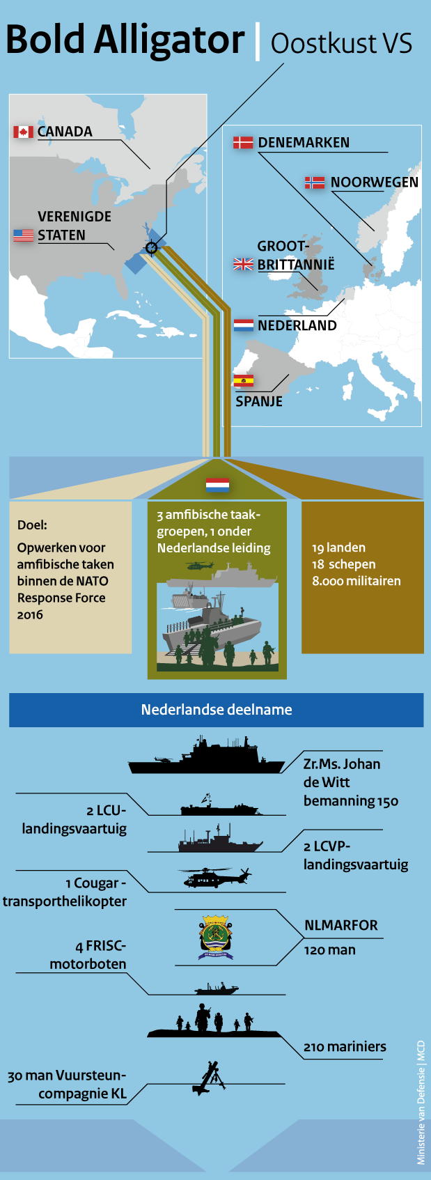 Wie niet groot is, moet slim zijn. Dat gezegde gaat ook op voor amfibisch optreden. In haar operaties vanuit zee werkt de Koninklijke Marine steevast nauw samen met haar bondgenoten. Tijdens de oefening Bold Alligator voor de oostkust van de Verenigde Staten gaven vloot en mariniers het zogeheten combined optreden een extra dimensie.