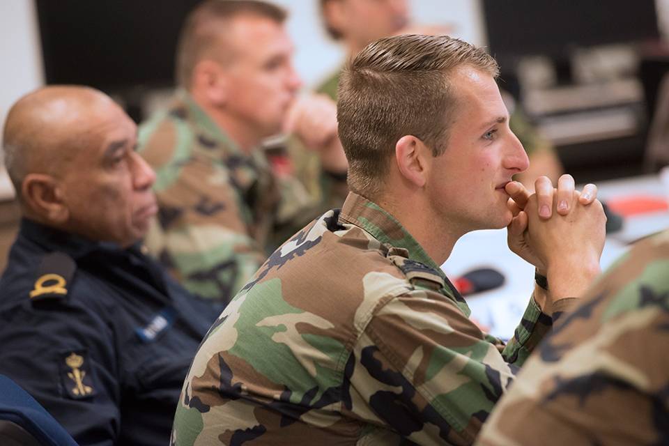 “Leider, vakman, manager en coach. De moderne krijgsmacht heeft moderne leidinggevenden nodig. Als je uit het juiste hout gesneden bent, moet je al die petten kunnen ophebben.” LTKOLMARNS Jos Schooneman en LTZ2OC Michael van Alderwegen onderbreken hun verhaal en kijken rond. Elf paar ogen staren terug.
