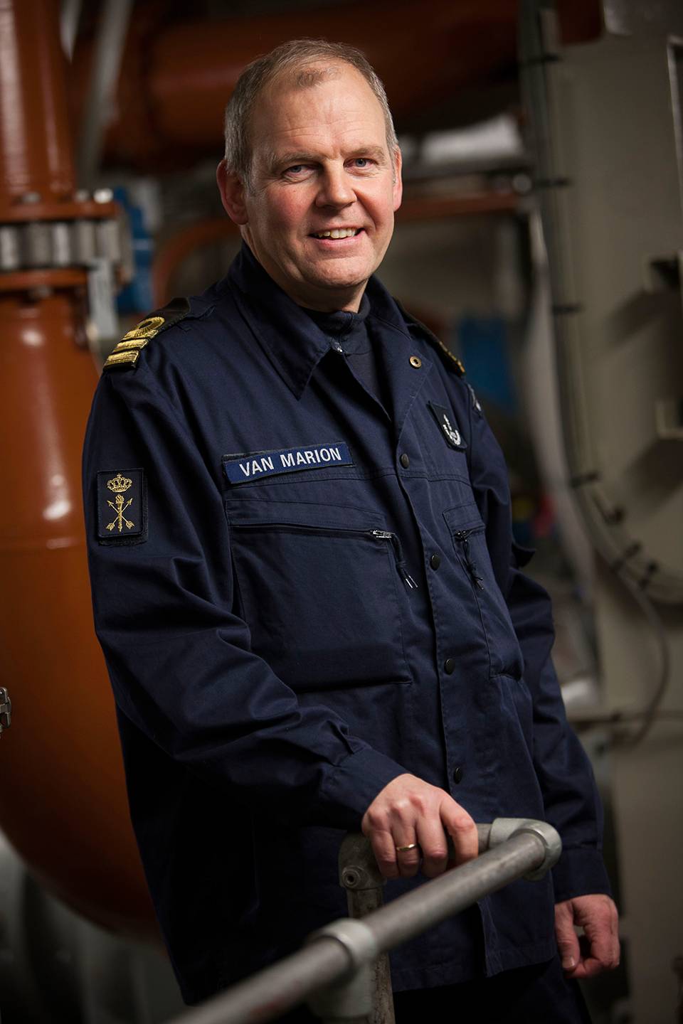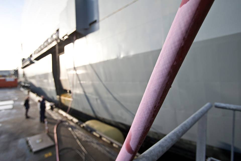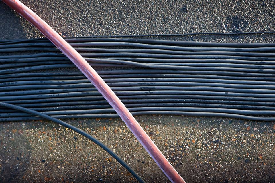 Een dik roze snoer, verbleekt door de zon en de zilte zeelucht, verbindt Zr.Ms. Johan de Witt met de walvoeding. Marine-engineer Edwin van Dijk wijst naar de lange kabel: “Deze ene kabel is bijna 15 keer dunner dan die 36 kabels bij elkaar en levert net zoveel vermogen.”