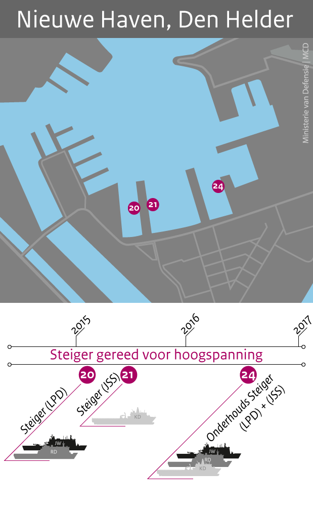 “Die aansluiting hebben we in driekwart jaar moeten ontwerpen en aanleggen”, vertelt Rinke Nijs, engineer van het Energiedistributiebedrijf (EDB) van de marine die mede zorgde voor de hoogspanningsinstallatie op de wal. “Dat komt omdat de bouw van de geplande hoogspanningsaansluiting gestopt was wegens de mogelijke afstoting van de Doorman. Toen werd besloten het schip toch in dienst te stellen, was een extra hoogspanningsaansluiting noodzakelijk. Het JSS kan namelijk moeilijker aanleggen bij steiger 20.” Medio 2016 kunnen de 3 schepen ook tijdens het onderhoud gebruik maken van een hoogspanningsaansluiting op steiger 24.