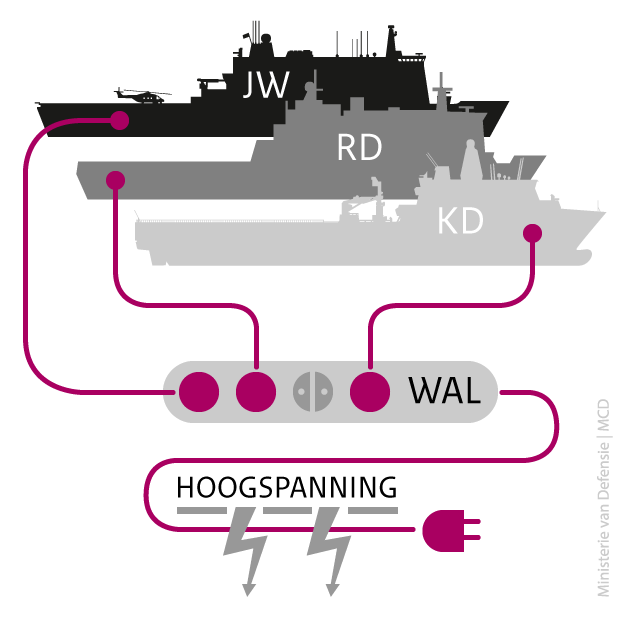 Als eerste marine in de wereld gebruikt Nederland sinds kort een hoogspanningskabel van 6,6 kilovolt (kV) aan wal. Voor de 3 grootste stroomvreters, Zr.Ms. Rotterdam, Johan de Witt en Karel Doorman, is de kabel een verademing. Op diverse gebieden levert het voordelen op.