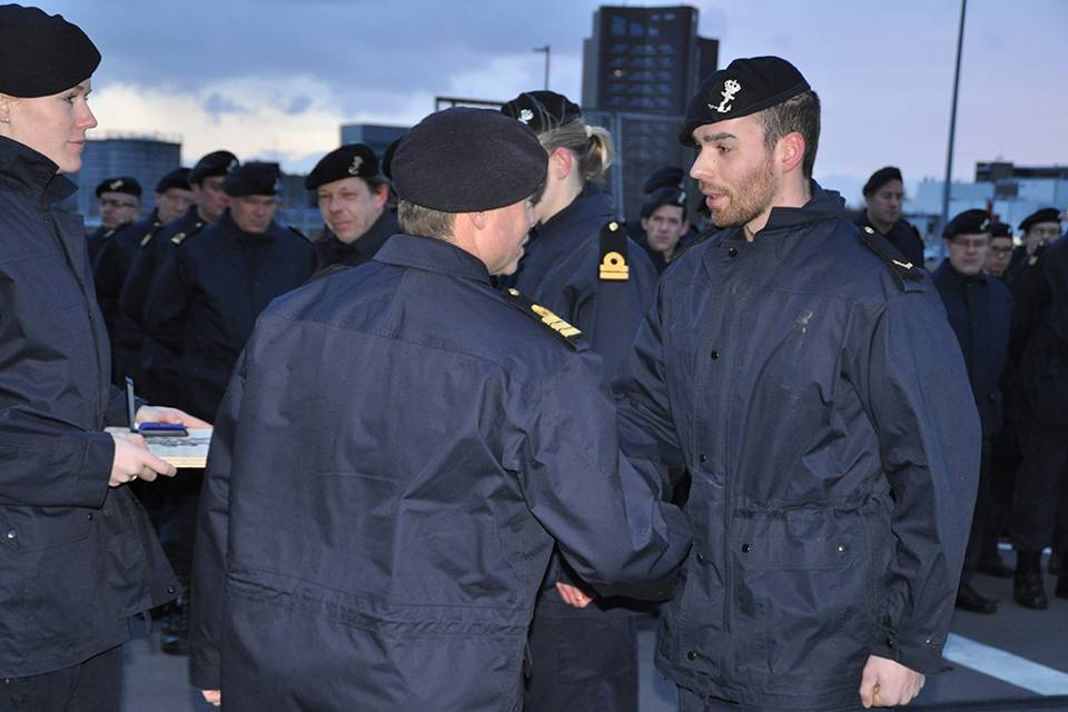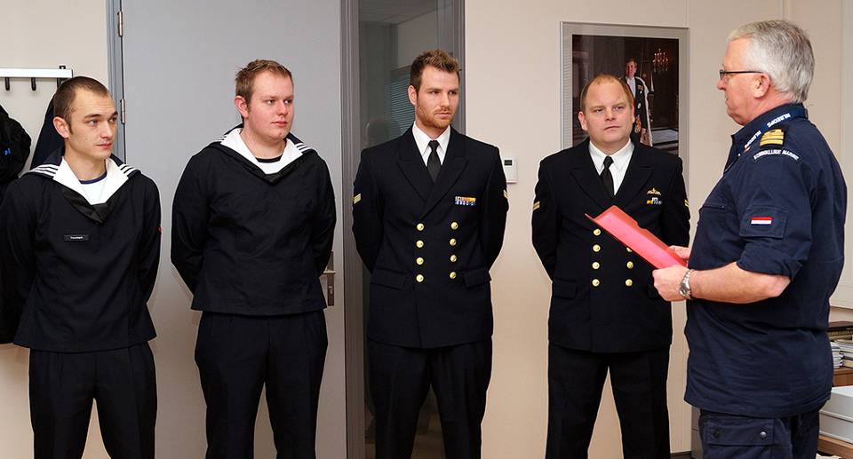 4 Bemanningsleden van Zr.Ms. De Zeven Provinciën ontvingen het gevechtsinsigne aan boord van het LCF. MATR1 OD Ricardo Scholten kreeg het gevechtsinsigne toegekend vanwege zijn optreden als MAG-schutter in de RHIB tijdens de antipiraterij-missie van Zr.Ms. Tromp. LTZ 1 (LD) Harold Pijcke, vlootpredikant Thijs Oosterhuis en LTZ2OC Nicole Sherriff-Vonk kregen het insigne toegekend vanwege hun handelen na de dubbele zelfmoordaanslag op een restaurant in Djibouti, waarbij zij zelf verwondingen opliepen.