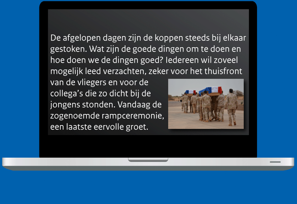Lees hieronder fragmenten uit het dagboek van Joost Margés, waarin hij schrijft over zijn werkzaamheden, de dilemma’s van verschillende eenheden en het overlijden van de vliegers kapitein René Zeetsen en eerste luitenant Ernst Mollinger in het inzetgebied.