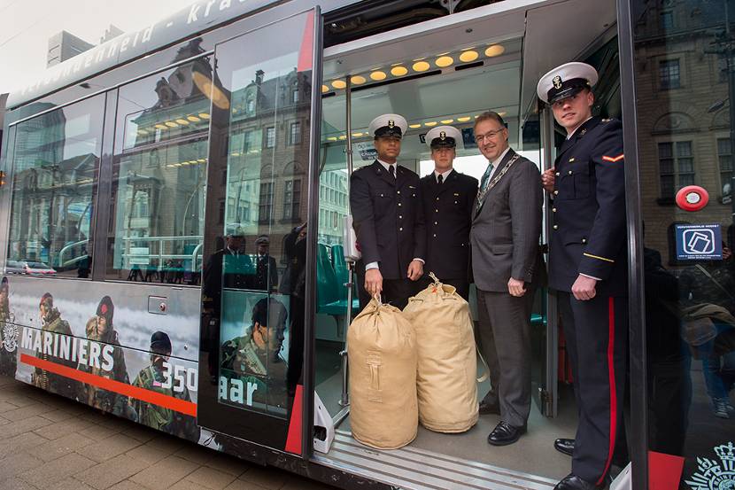 Rotterdam heeft er een bijzondere tram bij. Burgemeester Aboutaleb opende op donderdag 20 maart de deuren van een speciale ‘marinierstram’. Enkele mariniers-in-opleiding, die net als hun tienduizenden voorgangers gebruik maken van het openbaar vervoer in de stad, hadden de eer om het eerste ritje te maken in de met afbeeldingen van het Korps Mariniers versierde tram.