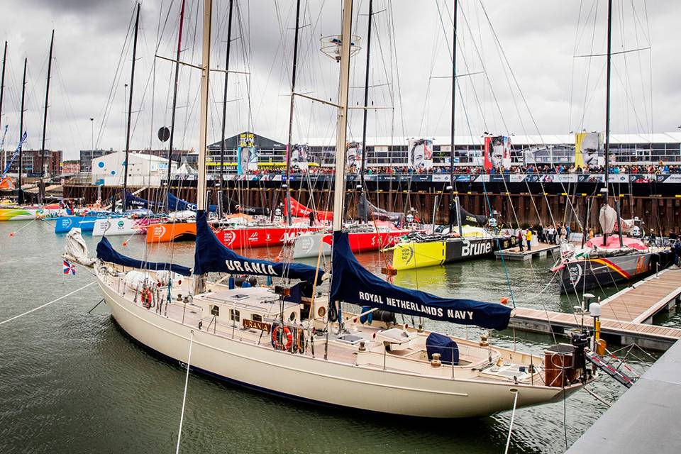 Ingetogen en bescheiden; zo ligt het statige opleidingsschip Zr. Ms. Urania erbij in Scheveningen, in de directe nabijheid van de gezeilde snelheidsduivels van de Volvo Ocean Race. De bemanning gaf het startschot voor het eerste vertrekkende schip. Ook werd het zeilende opleidingsschip ingezet als persboot. Inmiddels heeft het 7-tal raceboten de eindbestemming Göteborg in Zweden heeft bereikt. (Foto: Mediacentrum Defensie)