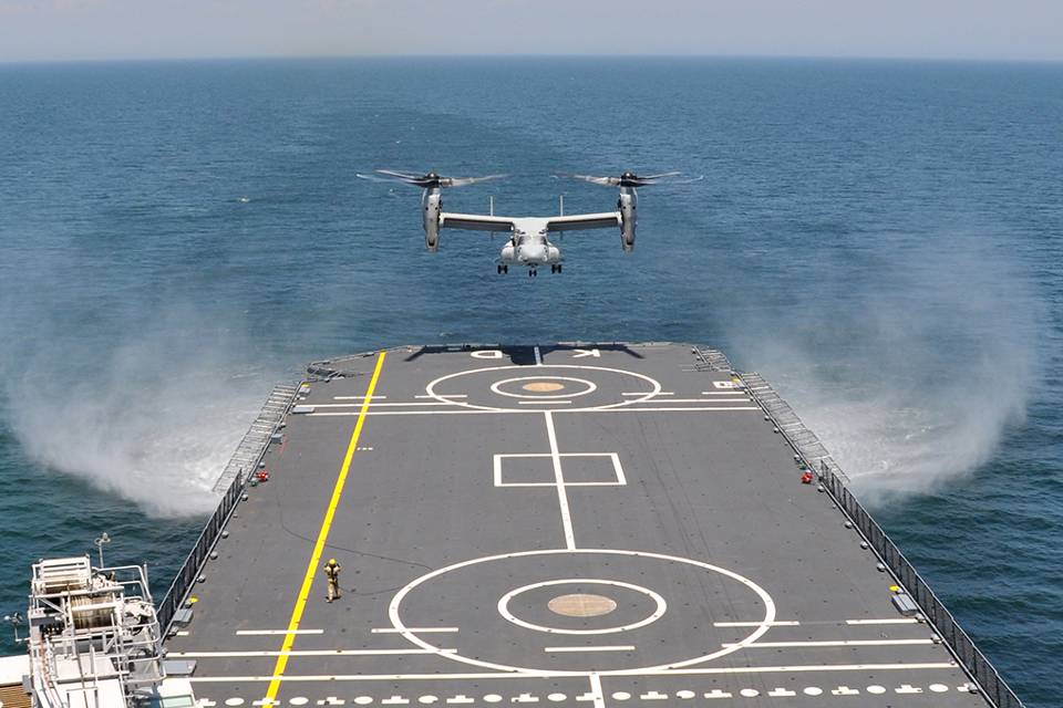 Op reis kom je soms bijzondere gasten tegen. Dit overkwam ook Zr. Ms. Karel Doorman tijdens haar zomerreis. Om de interoperabiliteit tussen Nederlandse schepen en het MV-22 Osprey tiltrotorvliegtuig van het United States Marine Corps te testen, werden 12 juni verschillende deklandingen en take-offs gedaan. Het was de eerste keer in 47 jaar dat een ‘vleugelvliegtuig’ een start en landing maakte aan boord van een Nederlands marineschip. Destijds was dat het vliegkampschip Hr. Ms. Karel Doorman. (Foto: Koninklijke Marine)
