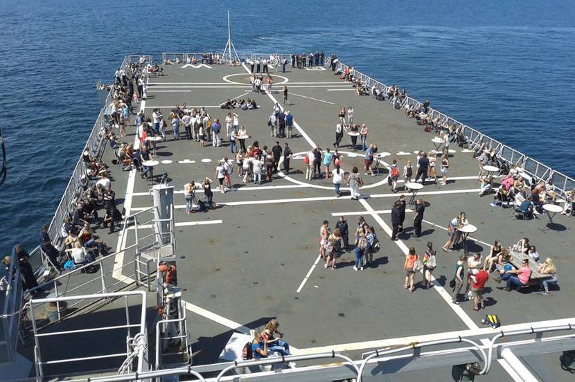 Ruim 200 dames in de leeftijd van 15 tot 26 jaar kozen op 1 juli het ruime sop, aan boord van Zr. Ms. Johan de Witt, een amfibisch transportschip van de marine. Sinds 1986 varen er vrouwen mee aan boord van Nederlandse marineschepen, maar dit aantal mag nog best toenemen. Nu schommelt het bestand aan vrouwen tussen 10 en 12 procent. “We willen graag dat meer vrouwen de marine als potentiële werkgever gaan zien, vandaar dat we zo’n dag organiseren”, zegt luitenant ter zee 2OC (SD) Kris Manders. Tijdens de vaardag konden de meiden overal rondkijken en ervaren hoe het is om aan boord te werken en te leven. (Foto: Koninklijke Marine)