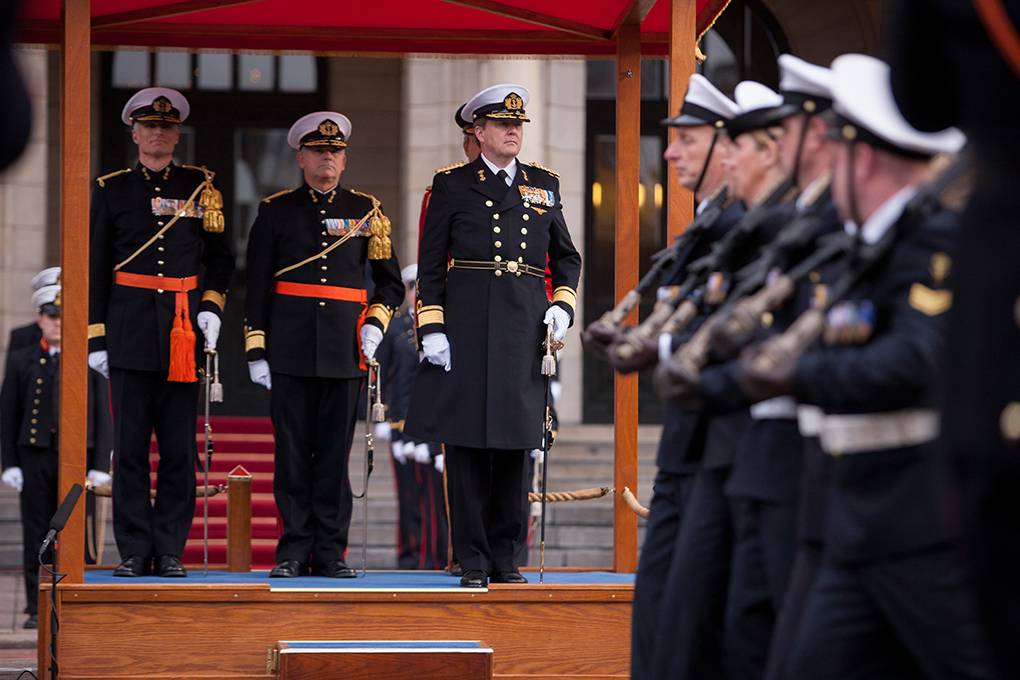 Na de speeches is het tijd voor een eeuwenoud eerbewijs aan de koning: joelen. Een bootsman fluit 3 keer, vervolgens gaan alle petten de lucht in en klinkt er een luid ‘hoezee’. Dit herhaalt zich 3 maal. “Dit stamt uit de zeiltijd en is zo mogelijk zelfs ouder dan het Korps Mariniers”, vertelt generaal Oppelaar. “Staande op de ra’s en in het want van de schepen, gaven de opvarenden van de oorlogsvloot op die manier luidkeels blijk van hun respect en waardering voor de vorst of vlootvoogd."