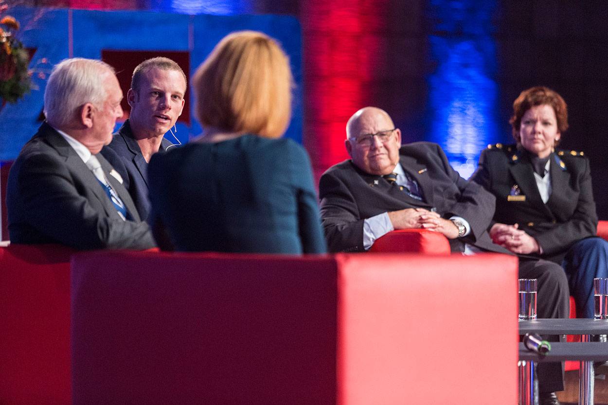 In de aansluitende panelbijeenkomst laat dagvoorzitter Brouwer 4 mensen aan het woord van divers pluimage. Generaal-majoor der mariniers b.d. Frank van Kappen, oud-marinier en drager van het Bronzen Kruis Wim Elgers, oud-mountain leader Jelle Staleman en Anja de Bruin, de districtschef van de Rotterdamse politie. Elgers houdt een emotioneel betoog over leiderschap in de praktijk, gebaseerd op zijn gevechtservaring in Nieuw-Guinea. Van Kappen is aansluitend cryptisch over teamprestaties: “Als je een sterk en zwak been hebt, moet je niet op het zwakke leunen. Hoe vang je zulke zwakte op in het team? Het gaat dan om onderling vertrouwen. Het belangrijkste daarbij blijft: de groep moet overleven.”