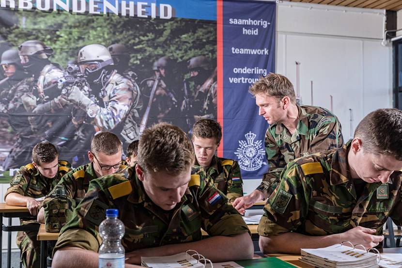 Al dat praten over én onderkennen van ieders sterke en zwakkere kanten betekent niet dat de militair-instructeur watjes aflevert na 2 of 3 jaar opleiding. “Het is ook doorbijten en gáán. We leiden hier wel op voor een elite-eenheid,” vervolgt hij streng. “Iedere marinier bereikt een keer een punt waarop hij denkt dat hij aan de max van zijn kunnen zit. Meestal kan hij dan nog wel een stapje verder en doet dat dan ook. Je sleept elkaar er doorheen.”