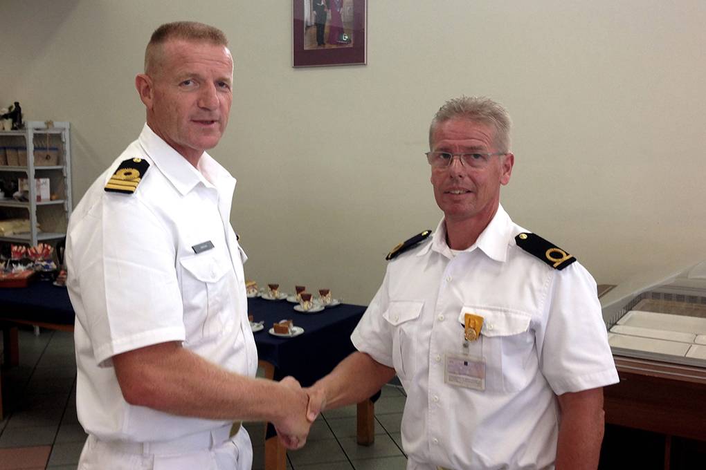 Frank Mens ontving onlangs de Gouden Medaille voor 36 jaar ‘landurige, trouwe en eerlijke dienst’ uit handen van KLTZ Gerard Hekkers, de commandant van Marinebasis Parera op Curaçao. Mens kwam in 1980 op als matroos ODND. Na afronding van de EVO ging hij varen met Hr. Ms. Callenburgh. Na plaatsing op Curaçao deed hij de korporaalsopleiding en werd hij kwartiermeester. Via een varende plaatsing op Hr. Ms. Zuiderkruis kwam hij in de automatisering terecht. Begin jaren ‘90 stapte hij over naar de Logistieke Dienst Administratie, vanwege een overschot aan kwartiermakers. Vanaf die tijd vervulde hij uiteenlopende LDA-functies in Nederland, bij NAVO-hoofdkwartieren en aan boord van meerdere schepen. Zijn huidige en laatste functie is die van kazerne-adjudant op Marinebasis Parera (Curaçao). Meest aansprekend aan werken bij de KM vindt Mens vooral de mogelijkheid om een diversiteit aan functies te bekleden. “Iedere plaatsing heeft weer een ander team en werkomgeving; het houdt je scherp en gemotiveerd.” Wat hem wel opvalt na 36 jaar bij de KM: “Ten opzichte van aanvang diensttijd en nu bemerk je een kentering in de mentaliteit van de medewerkers. De organisatie wordt steeds individueler. Het saamhorigheidsgevoel dat je destijds beleefde was te beschrijven als ‘maatjes door dik en dun’; tegenwoordig ben je ‘collega’s’.