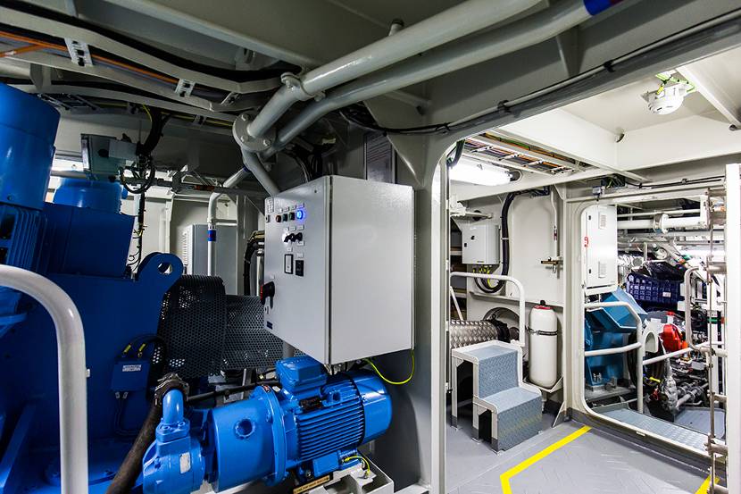 Aan de voorkant van deze besturing is een zeer bijzondere hybride aandrijving te vinden. “Voor het varen van 0 tot 5 knopen is elektrisch varen ideaal”, aldus de overste. “85 procent van de tijd lig je toch te wachten of ben je onderweg naar de meerpositie. De lithium Ion-batterijen leveren genoeg stroom voor 45 minuten varen. Heb je meer kracht en snelheid nodig, dan schakel je de 2 hoofdmotoren in.” Technisch detail: wanneer de hoofdmotoren draaien, schakelt de Volvo-dieselgenerator – die spanning levert voor verlichting, apparatuur en dergelijke – uit, en werken de elektromotoren juist als generatoren voor de spanning aan boord.