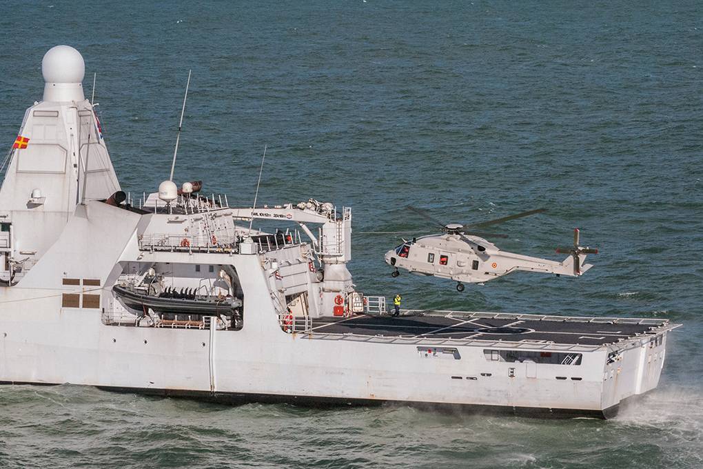 De kwalificatie van de eerste Belgische NH90-vlieger tot boordvlieger had een opvallend marineblauwe tint. De tientallen landingen en take off’s die de maritieme gevechtshelikopter maakte, gebeurden op het helidek van patrouilleschip Zr. Ms. Zeeland. “Vliegen is normaal vooral iets van de vlieger, maar bij een deklanding is het écht een team effort met de scheepsbemanning”, vertelt commandant Zr. Ms. Zeeland KLTZ Eric Toebast. Vanwege de trainingsmogelijkheid is hij blij met de komst van de Belgische en de Nederlandse NH90. Van de brug tot en met het achterdek zijn er bemanningsleden betrokken bij een deklanding. De officier van de wacht op de brug navigeert zo dat de heli veilig kan landen. Toebast: “De wind moet onder een bepaalde hoek staan ten opzichte van het schip. Dit kan onder operationele omstandigheden betekenen dat we ineens op ‘vliegkoers’ gaan varen, terwijl dat helemaal niet de richting is die we op moeten.”