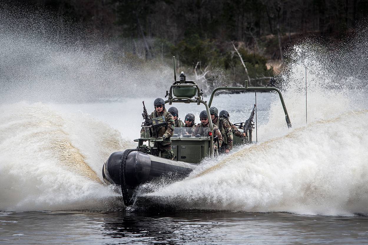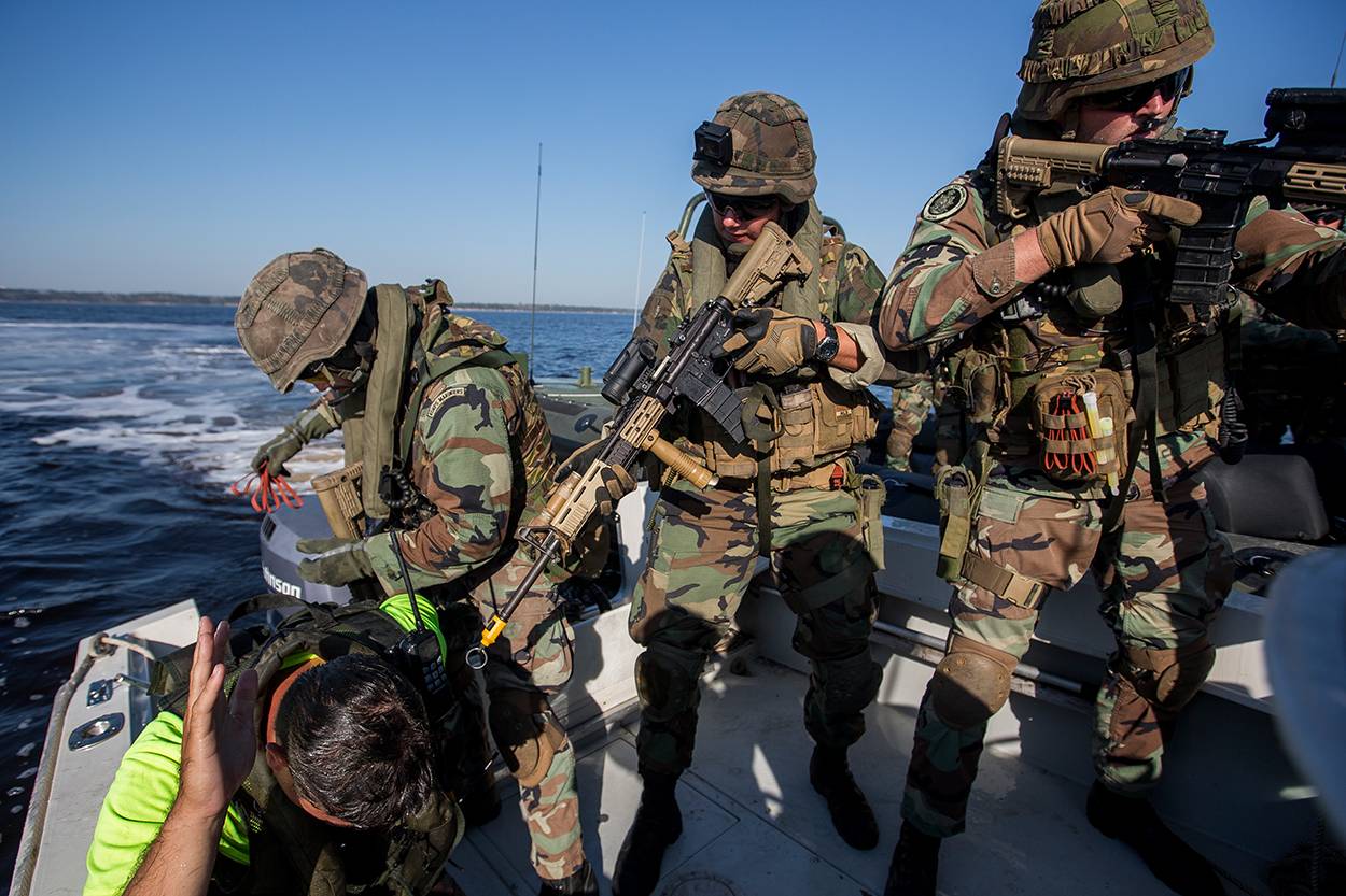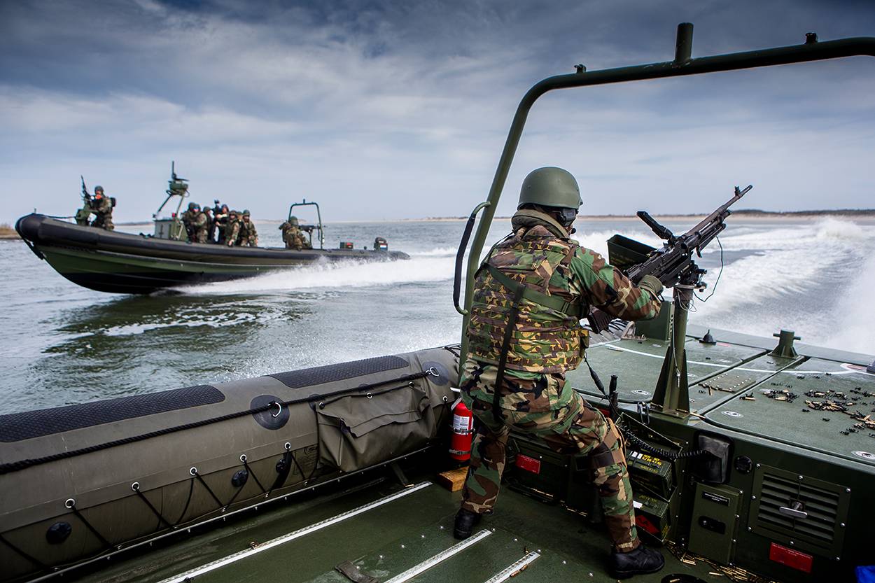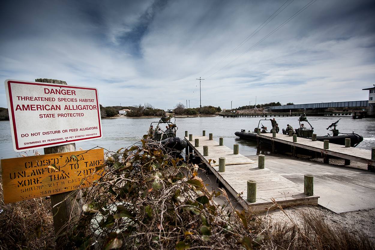 Eerste luitenant der mariniers Jeffrey Zoutendijk, commandant van de FRISC Troop, knijpt met zijn ogen tegen de felle zon als hij uitkijkt over de Atlantic Intercoastal Waterway. Er leven krokodillen tot 4,5 meter lang en het is een broedplaats voor hamerhaaien. Ook spannend. “Wat in Nederland of in de West niet kan, kan hier wel. Dat is vuren vanaf de FRISC richting doelen op het land”, zo vertelt Zoutendijk. “We kunnen hier perfect onze ‘riverine drills’ uitvoeren, inclusief ‘hot extraction’. Dan halen we mensen op terwijl zij en wij onder vuur liggen. Wij geven dan richting 2 flanken onderdrukkend vuur.”
