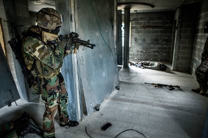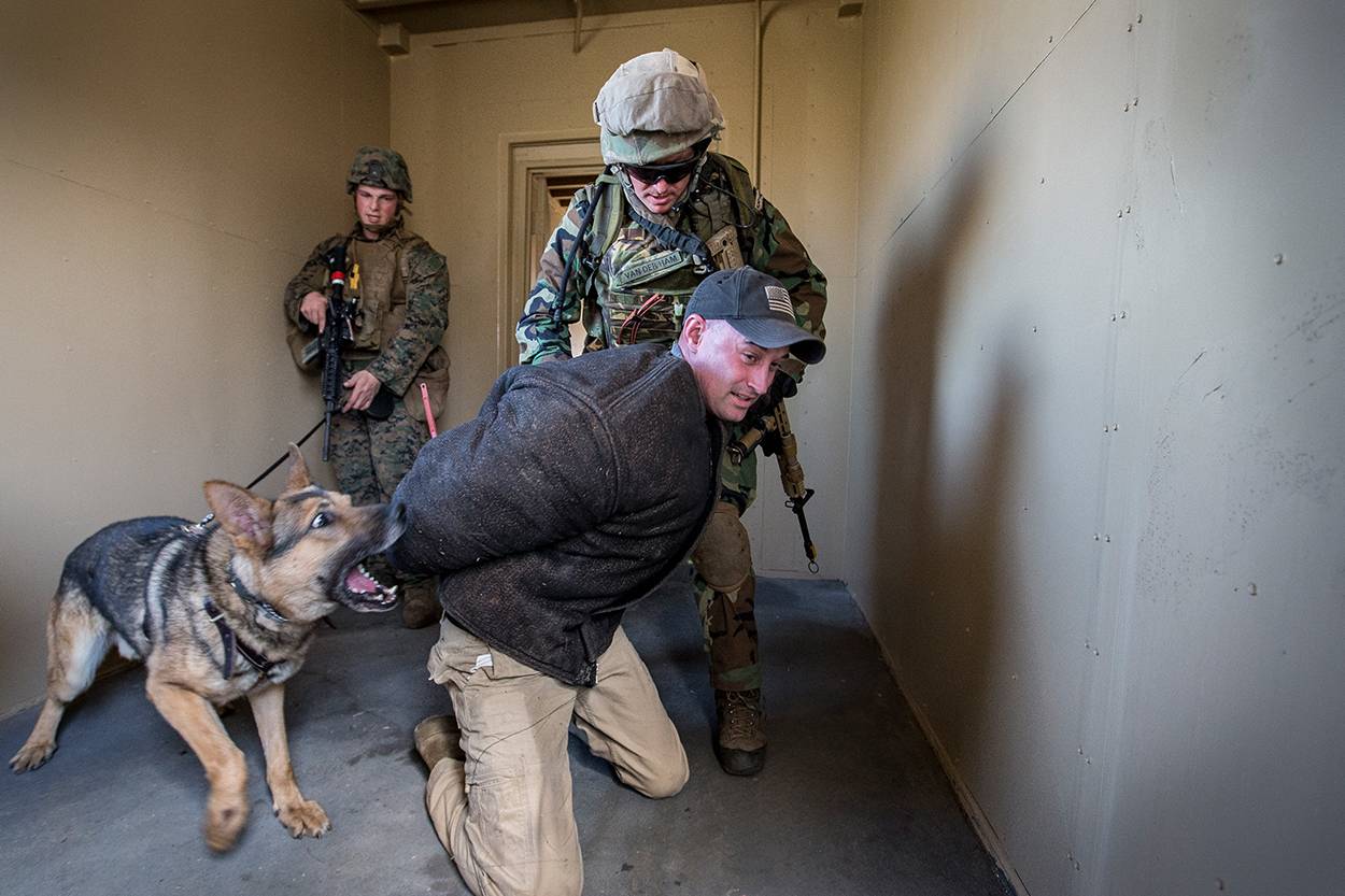Een dag later is de eenheid de ‘Quick Reaction Force’ (QRF) die hulp biedt wanneer een zogenaamde medische post van de Rode Halve Maan door strijders is ingenomen. De locatie is trouwens op Camp Davis, dat tegen Camp Lejeune aan ligt. (Kenners weten dat de Nederlandse Mariniersbrigade hier tussen 1943 en 1945 is opgeleid. Meer over deze eenheid verderop in dit magazine.) 2 Troop arriveert hier per Osprey en zuivert het complex. Het laatste woord is daarbij aan de bijthond van het USMC. Deze herder grijpt de Amerikaanse marinier die voor opstandeling speelt in zijn (beschermde) arm.