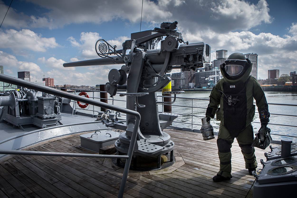 De bomverkenner hoorde bij 1 van de vele dreigingsscenario's binnen de grootscheepse havenbeschermingsoefening Port Defender Rotterdam. Deze vond van 11 tot en met 13 april in de Rotterdamse haven plaats. Deze levensader van onze economie geldt natuurlijk als potentieel doelwit voor terroristen. Gespecialiseerde eenheden van de Koninklijke Marine en politie trainden daarom 3 dagen samen met ketenpartners als Havenbedrijf Rotterdam en Veiligheidsregio Rotterdam-Rijnmond.