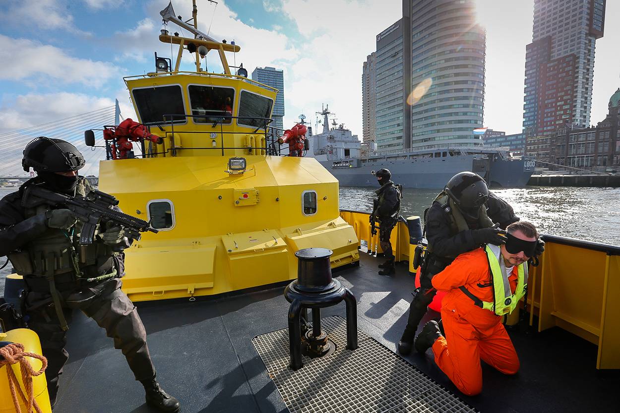 De Nautische Mobiele Eenheid van de politie maakt een einde aan een uit de hand gelopen betoging. De Dienst Speciale Interventies (DSI) – bestaande uit politiemensen en mariniers van de Netherlands Maritime Special Operations Forces (NLMARSOF) – bevrijdt een door terroristen gekaapt schip. Marineduikers speuren naar een overboord gesprongen en daarbij verdronken terrorist. Mariniers van het Maritime Advanced Search Team doorzoeken een schip op achtergelaten explosieven. Die worden dan weer onschadelijk gemaakt door militairen van de Maritieme Explosieven Opruimingsdienst. De Geneeskundige Hulporganisatie in de regio, brandweer en politie zijn op afroep beschikbaar om waar nodig bij te springen.