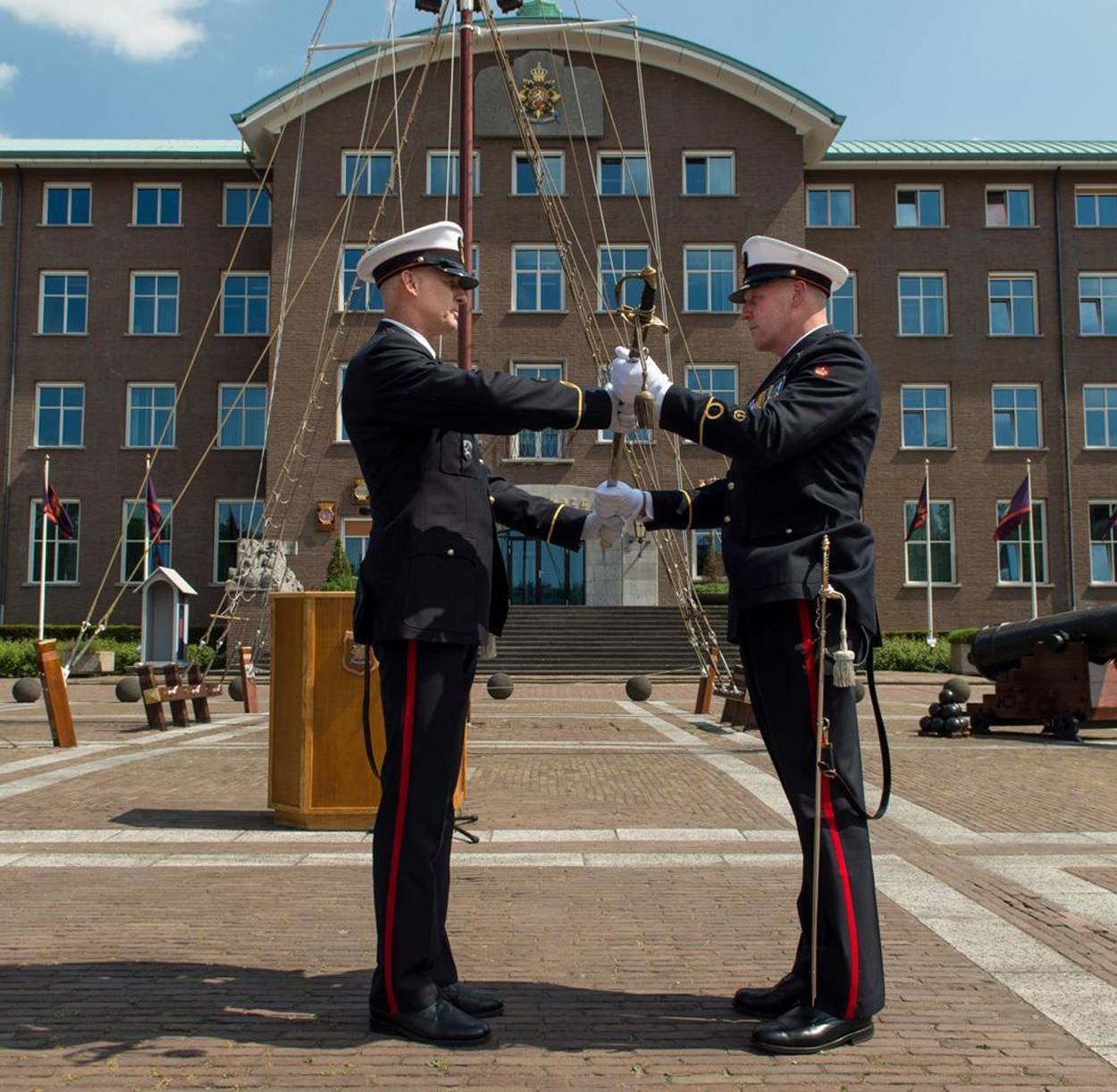 AOOMARNALG Ron van Leeuwen droeg op 13 mei op de Van Ghentkazerne in Rotterdam het marinierssabel van de Korpsadjudant over aan AOOMARNALG Rob van Haastrecht. Van Haastrecht is hiermee de 5e korpsadjudant sinds de invoering van deze functie. De commandant van het Korps Mariniers, BRIGGENMARNS Frank van Sprang, had waarderende woorden voor de terugtredende Van Leeuwen: “35 jaar in dienst van onze maatschappij, in dienst voor onze onderofficieren en in dienst van ons Korps; deze jaren zijn niet onopgemerkt gebleven”, gaf de commandant van het Korps Mariniers, BRIGGENMARNS Frank van Sprang, aan. ‘Met genoegen’ spelde de generaal dan ook het Ereteken voor Verdienste in zilver op het baratea-jasje van de adjudant.