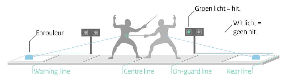 Elk schermwapen is via een ‘fil de corps’ – onder het schermpak – verbonden aan een ‘enrouleur’. Deze meebewegende draad zit vast aan aanwijsapparatuur met lampen, die oplichten bij een score. Met 3 verschillende wapens komt je op steeds andere manier tot scoren: