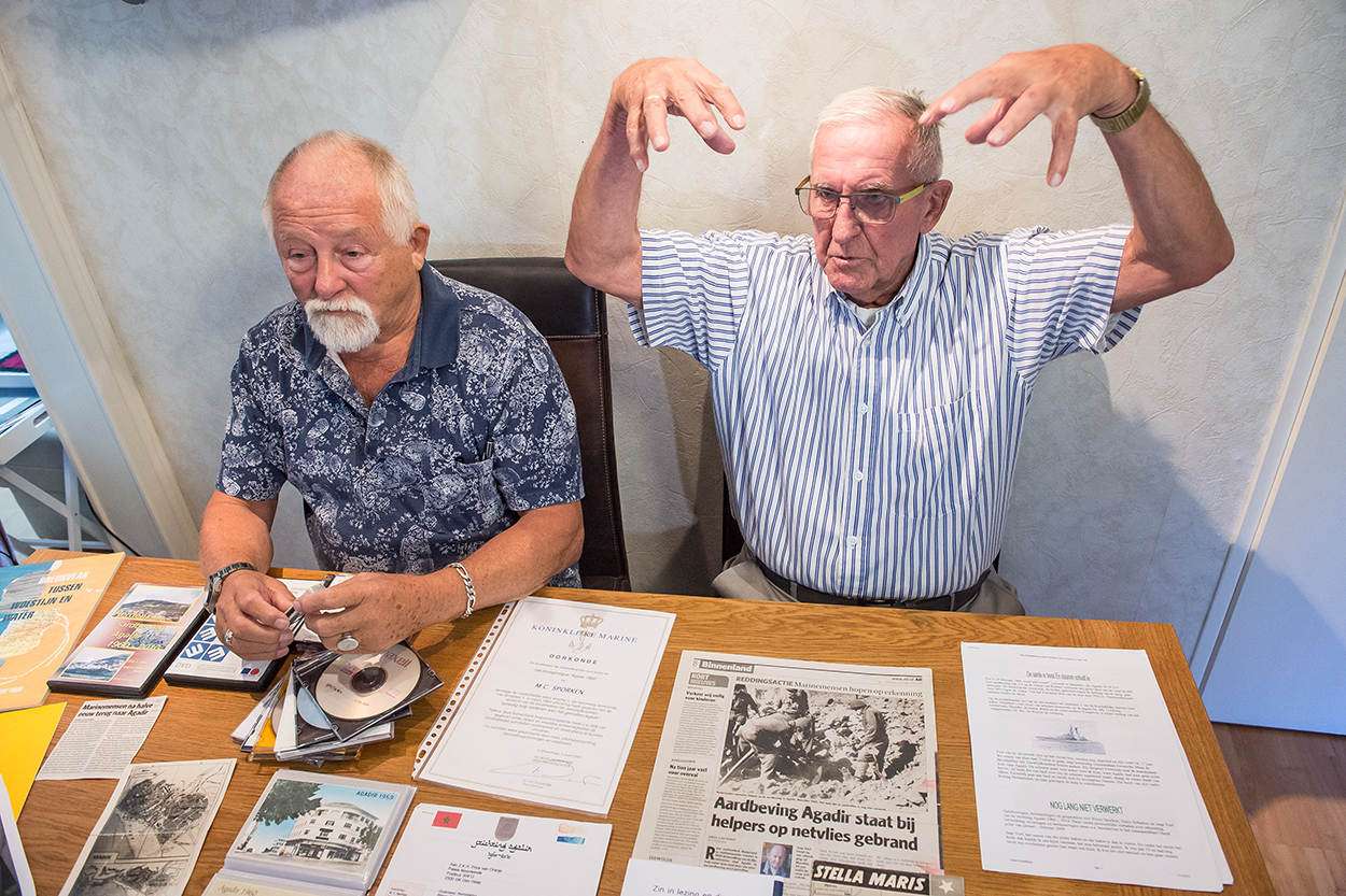 “We voeren met het Smaldeel in de Middellandse Zee”, blikt Sporken terug op de tijd van toen. “We hadden net een grote oefening afgerond. Op 50 mijl van Gibraltar kreeg Smaldeelcommandant kapitein ter zee Ferwerda bericht dat Agadir was getroffen. Met meerdere schepen sloegen we linksaf.” Binnen een dag was het vlootverband bij Agadir, waarop de De Ruyter dicht onder de kust voor anker ging. Daar dreef een intense lijkenlucht de opvarenden al tegemoet. “Met een deel van de staf gingen we per sloep aan land om te overleggen met de Marokkanen wat we konden doen”, vervolgt Sporken. “Of we in de arme wijk Founti konden zoeken naar overlevenden, was het verzoek. Van die wijk was niets meer over.”