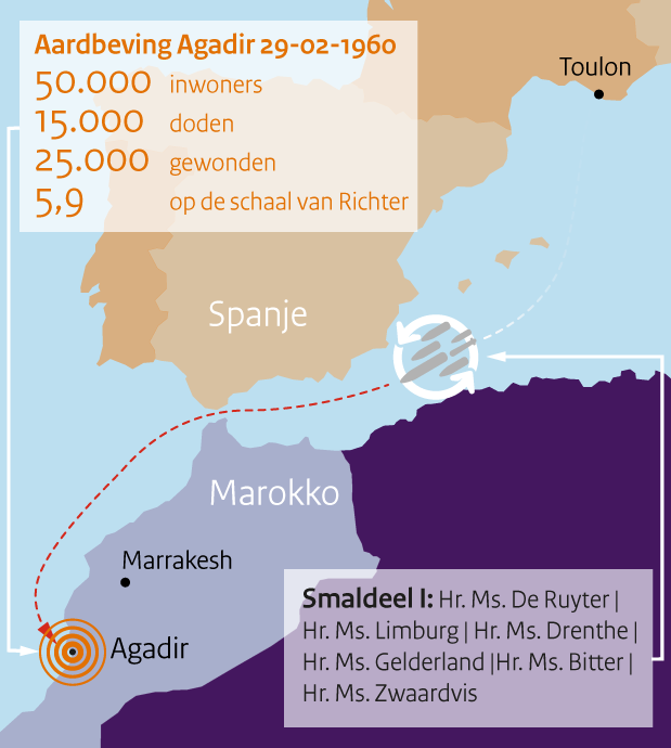 Het vlootverband Smaldeel 1 voer op 29 februari 1960 ten zuiden van Spanje, toen het bericht binnenkwam dat het Marokkaanse Agadir getroffen was door een aardbeving van 5,9 op de schaal van Richter. Een beving van 15 seconden eiste 15.000 doden en 25.000 gewonden, op een bevolking van 50.000 mensen. Een deel van Smaldeel 1 zette met hoge vaart koers naar het crisisgebied, voor humanitaire hulp; een vorm van inzet die toen relatief nieuw was. 2 oud-opvarenden vertellen.