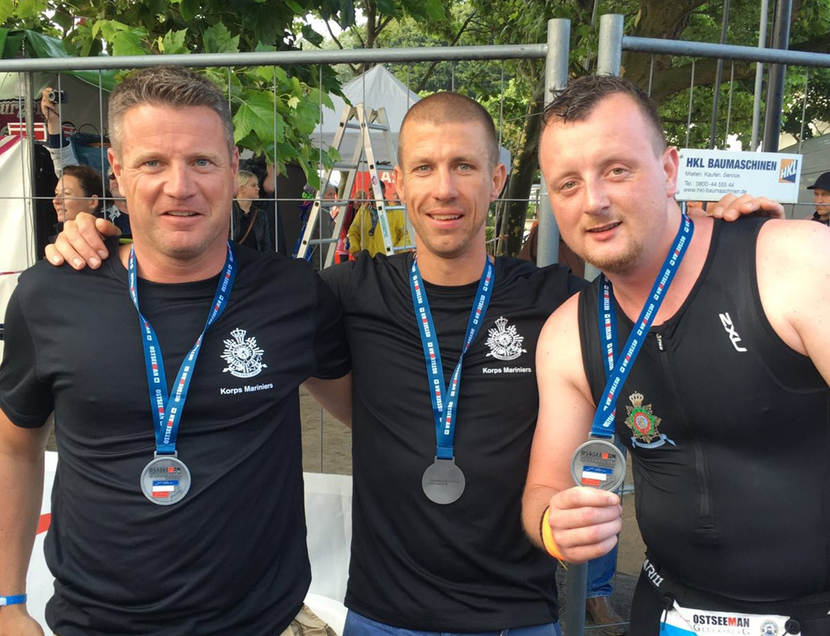 Op uitnodiging van het Duitse See Battalion heeft een team van het CZSK op 7 augustus deelgenomen aan de Ostseeman Triathlon, in Glücksburg. SMJRMARNALG Wim Korving, LTZ 2OC Nico Langendijk en KPLMARNALG Mark van Wijk (foto) namen deel aan de relay en finishten in een tijd van 11.16,35 uur, waarmee ze een nette zevende plaats behaalden. KAPTMARNS Martijn Sluis en SGTMARNVB Daan Haasbroek hebben de individuele afstand afgelegd. Sluis finishte in 11.45,55 uur en werd daarmee keurig tweede in de categorie 25-29 jaar voor militairen. Haasbroek finishte in 11.50,32 uur. Al met al een uitstekende sportieve prestatie van de Nederlandse deelnemers en een mooie bijdrage aan het nieuwe samenwerkingsverband tussen het Duitse See Battalion en het CZSK.