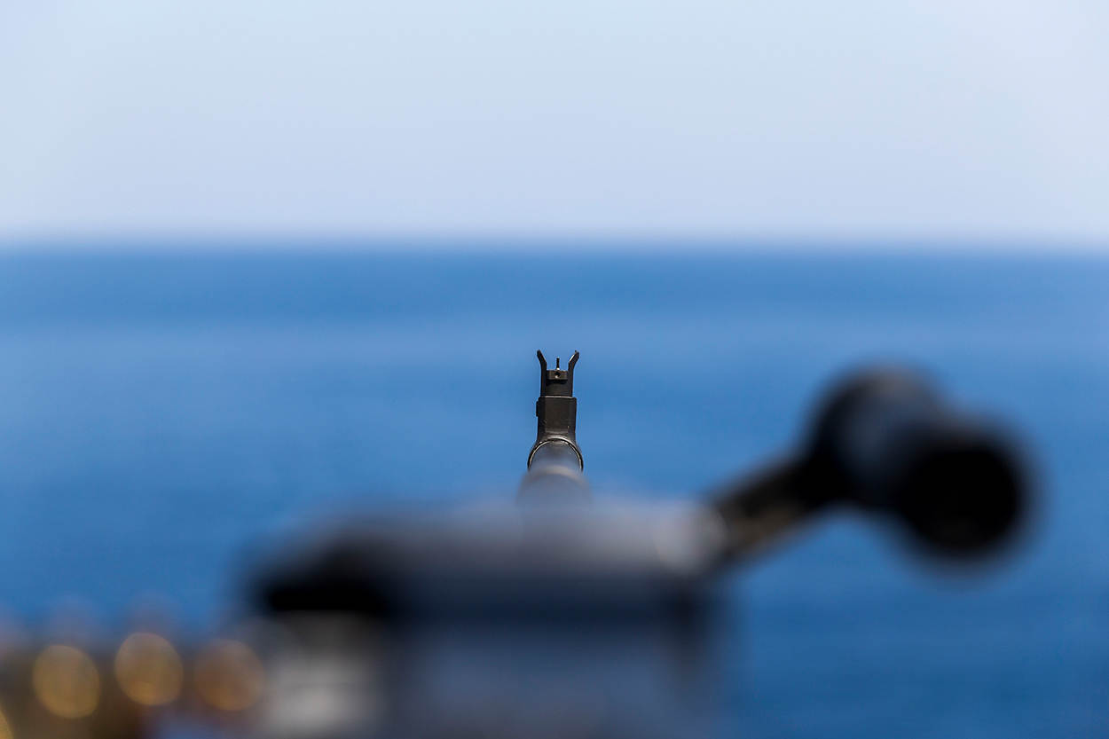Marinier Auke heeft de wacht en beweegt zich direct naar de rechter brugvleugel. Ook hij pakt de verrekijker erbij en neemt de skiff onder observatie. “De rechter heeft 2 man aan boord. Maar links zie ik 6 personen.” De dreiging constant in de gaten houdend, neemt Auke telkens een stapje naar rechts tot hij bij de MAG uit komt. De kap die het wapen bedekt, schuift hij subtiel naar voren zodat de kolf zichtbaar wordt. “Ik wilde ze duidelijk maken dat wij bewapend zijn en het schip zouden beschermen”, vertelt Auke later. Naarmate het schip dichter bij de skiffs komt, tekenen de boeien van een visnet zich af. Vals alarm.