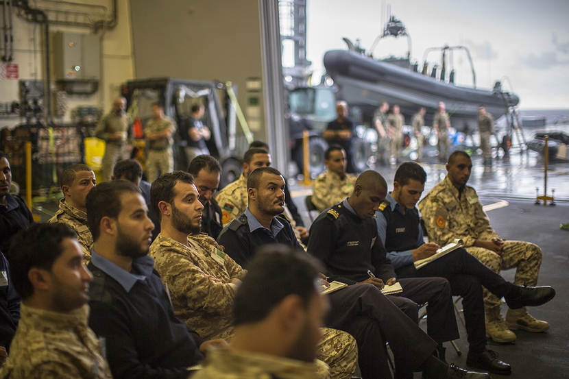 De Rotterdam is overigens niet het enige varende klaslokaal. Het Italiaanse amfibisch transportschip San Giorgio is in de buurt. Aan boord krijgen de trainees les in navigatie en mensenrechten. Eenmaal thuis moeten ze alle vergaarde kennis en ervaring op hun collega-kustwachters overbrengen. De Libische kustwacht heeft voor de Arabische lente betere tijden gekend. Maar nog steeds bezit zij vermogen tot zelfverbetering. Regelmatig zie je oudgedienden hun minder ervaren collega’s bijstaan. “Het niveau van de cursisten verschilt nogal”, zegt een trainee. “Sommigen van ons werkten 30 jaar lang in de koopvaardij. Anderen hebben bij wijze van zeggen nog geen natte voeten gekregen.”