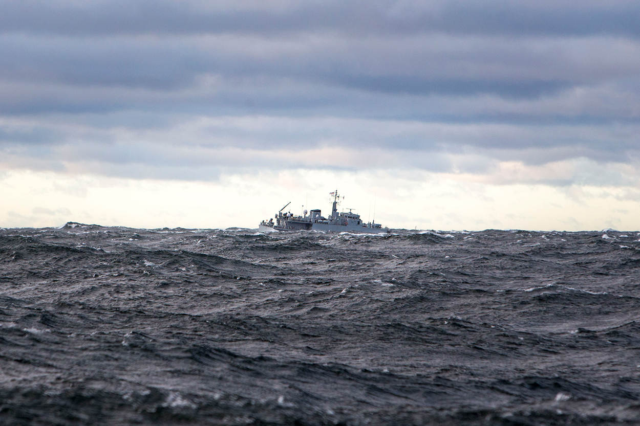 Met een slordige 12 knopen ploegt Zr. Ms. Vlaardingen door het grijze water van de Oostzee. Een koude wind uit het noorden klopt het water op tot kleine golven. De grauwe lucht maakt dat de overgang tussen zee en lucht soms nauwelijks te zien is. Veel maakt dat echter niet uit. De 37-koppige bemanning houdt zich vooral bezig met wat er onder de zeespiegel gebeurt. Dat gebeurt vanaf een mijnenjager die toch écht zijn beste tijd gehad heeft.