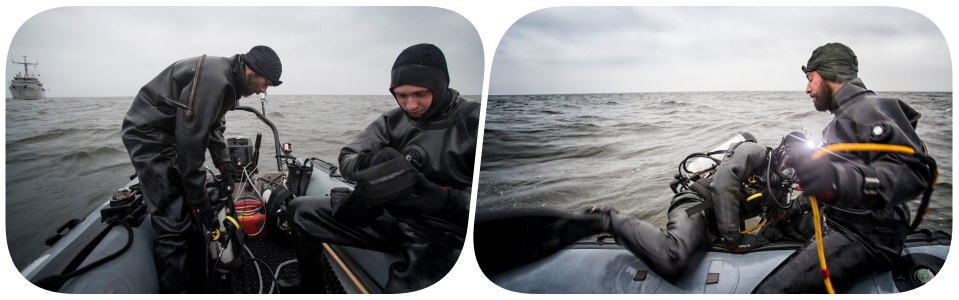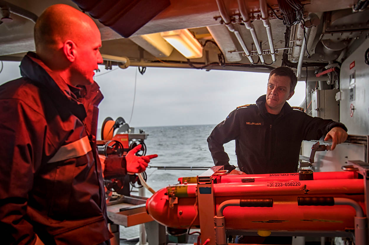 “We komen hier van alles tegen onderwater”, vertelt korporaal BDA-duiker Rob Bos, terwijl de mijnenjager even stil ligt voor de kust van Letland. “Het is een speeltuin voor ons; er ligt van alles. Bureaustoelen, olievaten, containers, houten kratten, wrakken en,” – hij wijst naar het donkere water voor zich –, “af en toe een zeemijn.” Naast hem heeft korporaal TD Tim Brouwer net de laatste controles uitgevoerd aan de oranje Seafox-I (‘Investigate’), een onderwaterrobot waarmee objecten op de zeebodem kunnen worden geobserveerd.