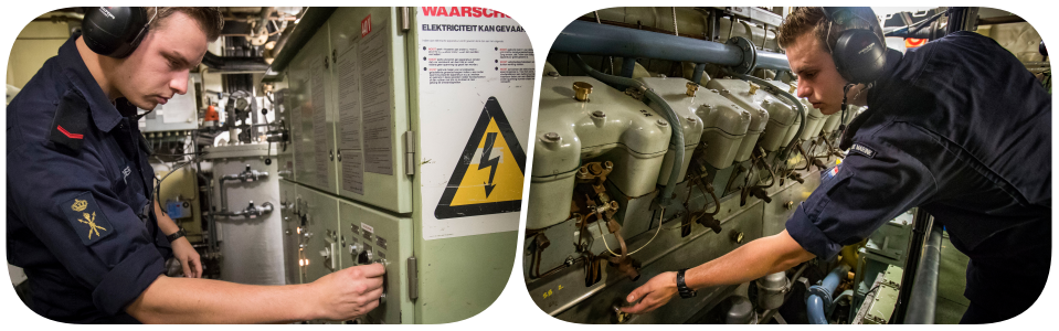 Inspectie van de ingewanden van het schip bevestigt zijn verhaal. Assistent-monteur matroos 2 TD Geoffrey Mulder en zijn collega’s moeten alles uit de kast trekken om de oude motor van het schip te laten draaien. “We hebben constant storingen”, legt Mulder uit. “Laatst nog ontstond er een lek in een smeerolieleiding en stroomde er 800 liter olie het ruim in.” Hij toont de plek waar de leiding met ‘vloeibaar metaal’ dichtgemaakt is. Ook op andere punten lijkt de 30-jaar oude motor hard aan vervanging toe. Mulder: “Door verweerd rubber, los getrilde pakkingen en metaalmoeheid gaan steeds meer onderdelen kapot.”
