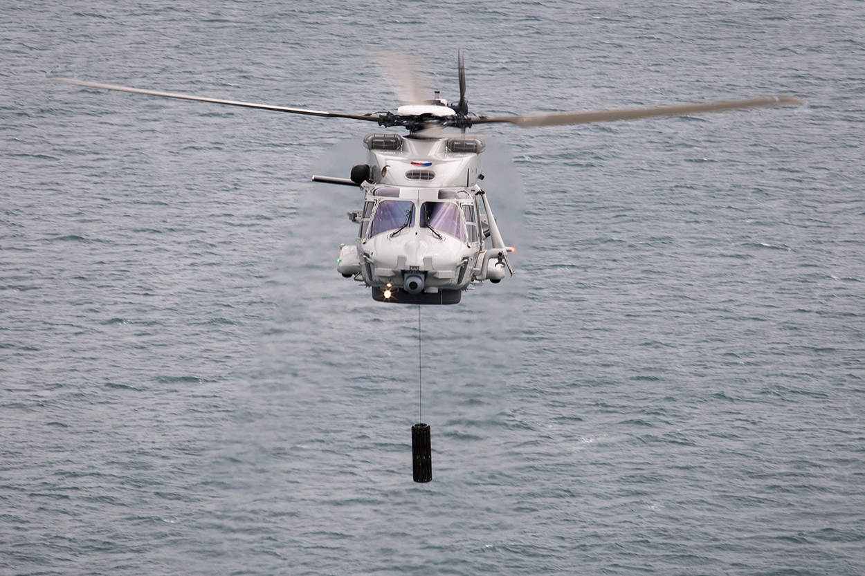 “2 keer per jaar oefenen we met 3 NH90’s vanaf Naval Air Station Culdrose in Engeland”, steekt de vliegende marineman van wal. “Vanaf hier doen we mee met de series van de Britse ‘Flag Officer Sea Training’, samen met onderzeeboten, marineschepen, vliegtuigen en andere helikopters van bondgenoten. De trainingswaarde daarvan gaat die van trainen in Nederland te boven. Aan onze kant van de Noordzee kun je beperkt onderzeebootbestrijding oefenen, vanwege de geringe diepte van de Noordzee.”