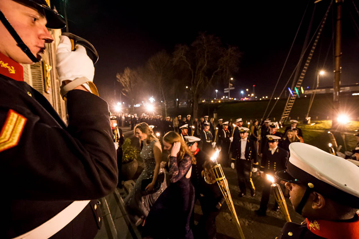 Na het showtje vertrekt iedereen naar het hoofdgebouw van het KIM om daar te genieten van het traditionele bal. De dames en heren flaneren over de oprijlaan, langs de fakkelwacht met knerpend vuur.
