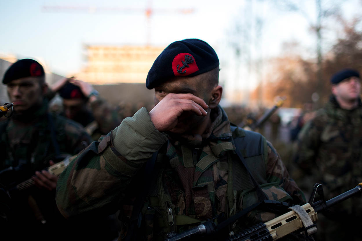 “Ik ben zo enorm blij dat het voorbij is”, verzucht Mike. Gretig doopt hij een droge snee brood in iets wat op soep lijkt en neemt voldaan een hap. “Maar ik mag mezelf nu marinier noemen. Het is de pijn meer dan waard.”