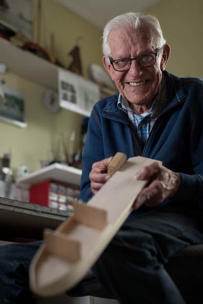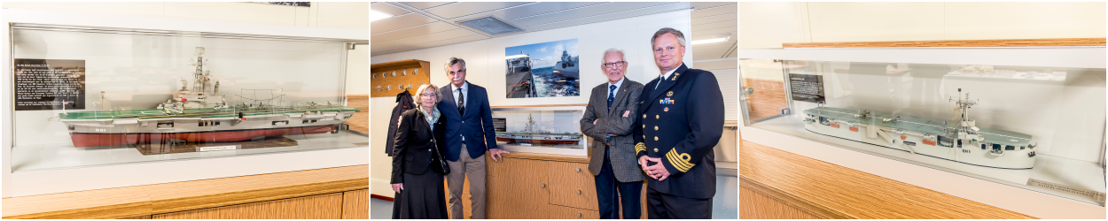 Herman Witteveen spendeert al zijn hele leven veel tijd aan het repareren en maken van scheeps- en vliegtuigmodellen. Zo heeft hij eindeloos veel uren besteed aan de productie van schaalversies van Hr. Ms. Karel Doorman I (ex-HMS Nairana 1946-1948) en de bekendere Karel Doorman II (ex-HMS Venerable 1948-1968). Eind april heeft het bestuur van de Stichting Vrienden van de Traditiekamer deze 2 modellen geschonken aan het Joint Support Ship Zr. Ms. Karel Doorman. Commandant KTZ Sim Schot (foto) van de huidige Karel Doorman en een deputatie van de bemanning toonden zich zeer verguld met de geschenken.