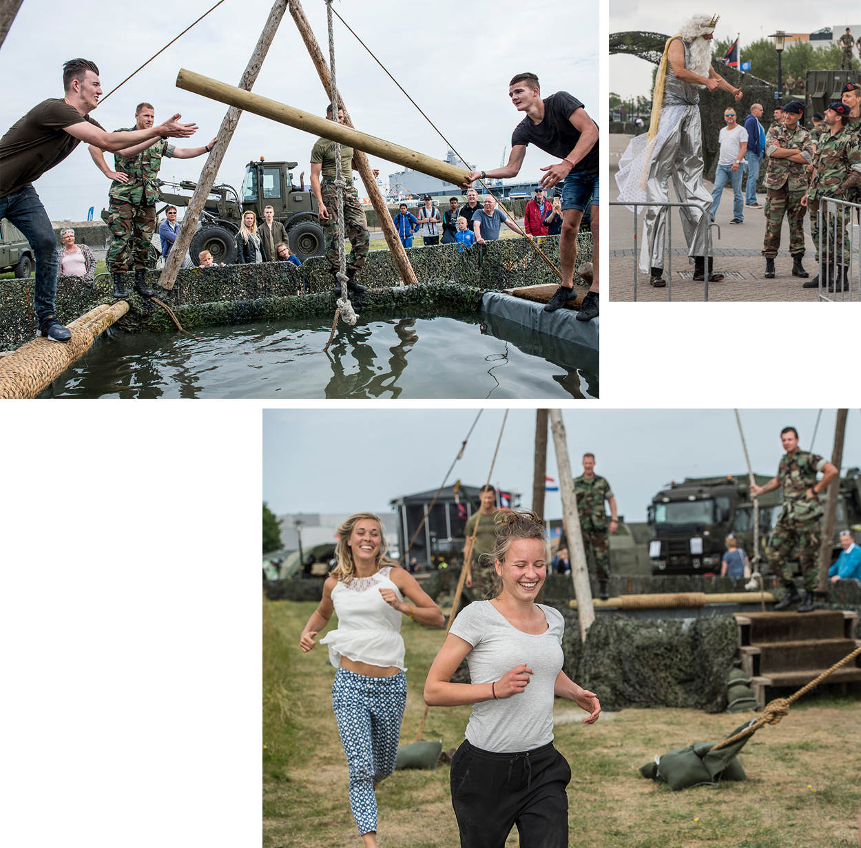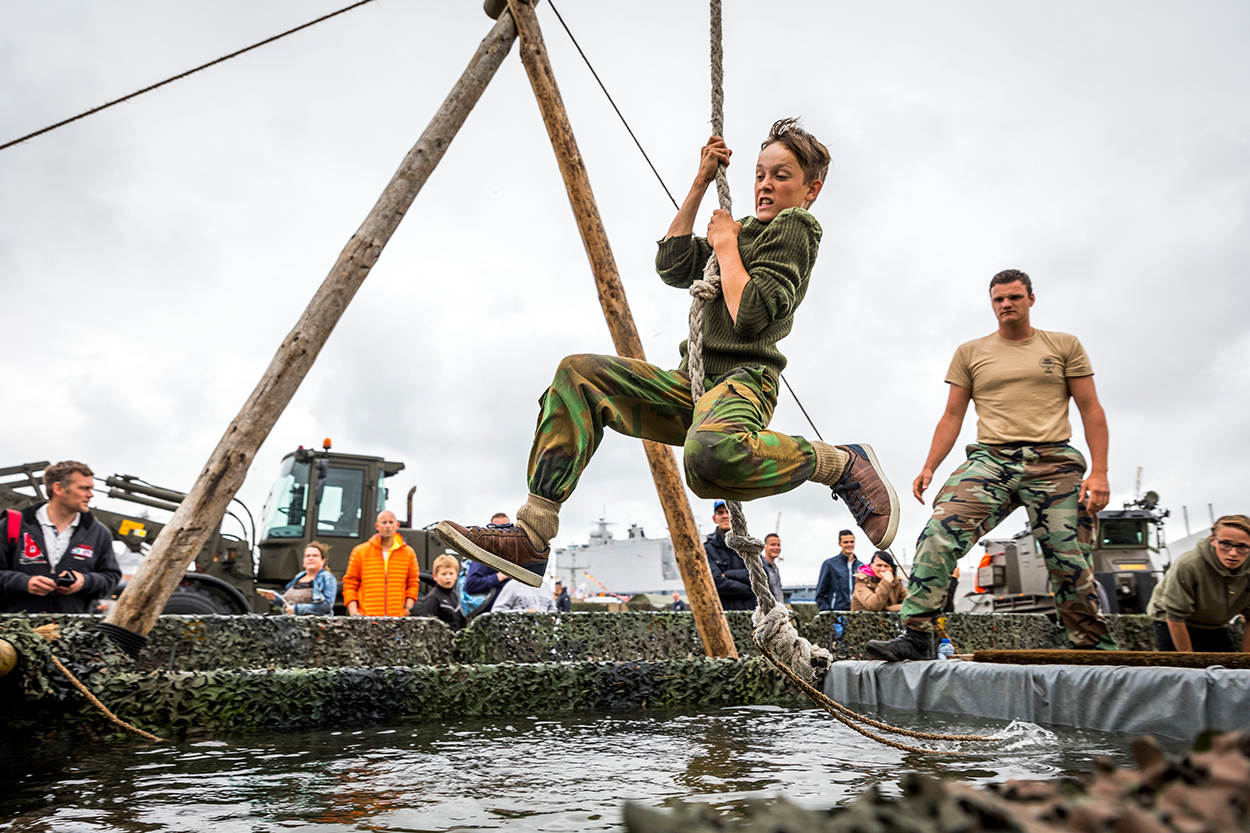 Kijkmomenten te over, maar wie liever zelf actief bezig is, gaat naar het compound van de mariniers. Lang niet iedereen verlaat dit kamp droog. De hindernisbaan, inclusief grote bak water, waar bezoekers zich met een touw overheen moeten slingeren, is de boosdoener. “Vooral voor de volwassenen”, lacht korporaal van de mariniers Niels van Doorn. De afgelopen dagen heeft hij er toch zeker al een man of 30 in zien vallen. “De jonkies houden zich wel vast. Ouderen laten sneller los.”