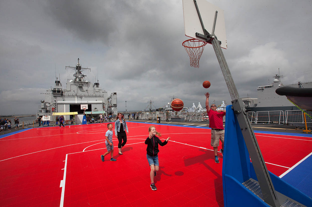 Op Zr. Ms. Rotterdam is een drogere activiteit gaande. Het helidek is omgetoverd tot knalrood basketbalveld. “Zo groot had ik het hier niet verwacht”, zegt de 11-jarige Sjoerd, rondkijkend over het dek van het amfibische transportschip. Samen met zijn ouders, broer en zusje was hij een dag eerder ook al bij de Marinedagen. “We hadden lang niet alles gezien, dus hebben we er een dag aan vastgeplakt”, zegt zijn moeder. “We waren alleen op de Karel Doorman al een paar uur bezig.”
