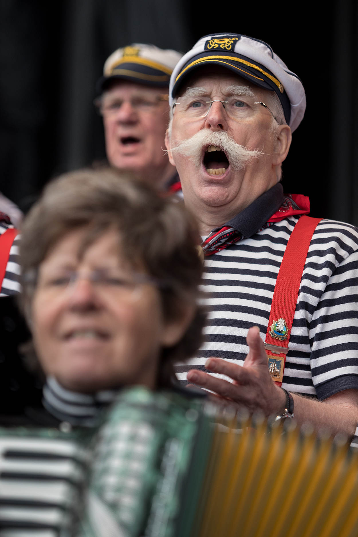 De klanken van ‘Als de klok van Arnemuiden’ klinken over het haventerrein. Uit volle borst zingen de mannen van het zeemanskoor hun tekst. Blauw-wit gestreepte shirts aan. Matrozenpet op. Accordeon prominent vooraan op het podium. De zingende zeemannen staan op de steiger waarlangs ook de trekpleisters van de Marinedagen aangemeerd liggen: Zr. Ms. Karel Doorman, Zr. Ms. Tromp en Zr. Ms. Rotterdam. Ernaast de mijnenvegers. Allen rijkelijk gepavoiseerd en met de historische, zeilende Tallships als sfeervolle achtergrond.
