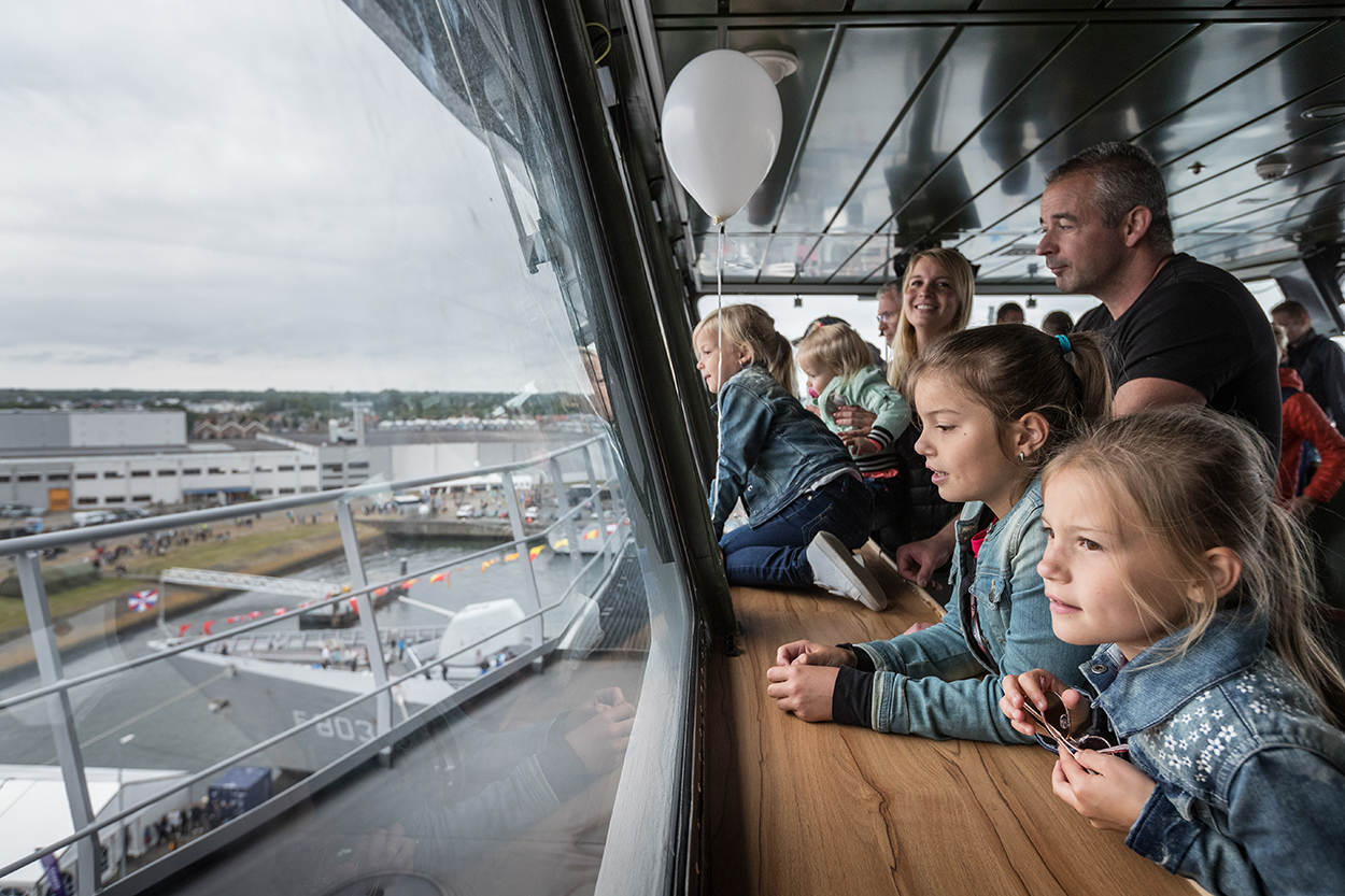 Voor de één is het nostalgie, een ander stapt tijdens de Marinedagen voor het eerst aan boord van een marineschip. De zusjes Megan, Kayleigh, Caithlyn en Skyler vallen in die laatste categorie. Op de brug van de Karel Doorman zitten de peuter, kleuter en de 2 oudsten aan het raam gekluisterd. “Heel indrukwekkend dit uitzicht”, zegt moeder Charlene Luik. “We dachten: leuk een dagje uit. Ik heb dan wel 4 dochters, maar ze houden juist heel erg van helikopters, vliegtuigen en boten.”