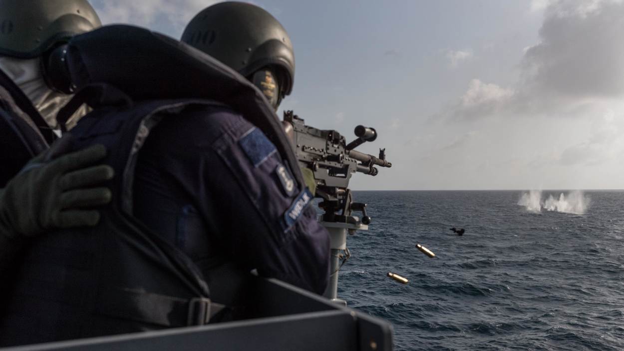 Bekijk de clip om te zien hoe MATR 1 TD Weidijk aan boord van Zr. Ms. Rotterdam oefent met boordwapens.