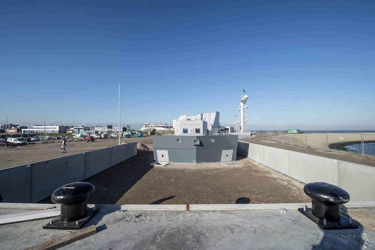 Hoofdaannemer Tuin realiseerde het imposante bouwwerk, samen met een rijtje onderaannemers. Dat scheepsbouwer Damen het scheepsstaal leverde, is geen verrassing. “De opstelling stelt om te beginnen de BOZ-positie voor van Zr. Ms. Karel Doorman”, vertelt luitenant ter zee 2OC John Wennink, Hoofd Zeemanschap. “Via de portaalmast kan het laadstation van een Luchtverdedigings en Commando Fregat (LCF) aan de overkant bevoorraad worden.”