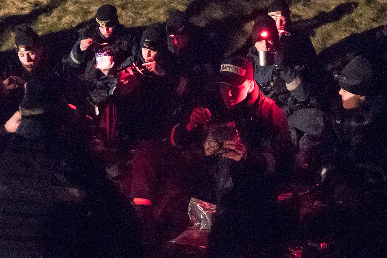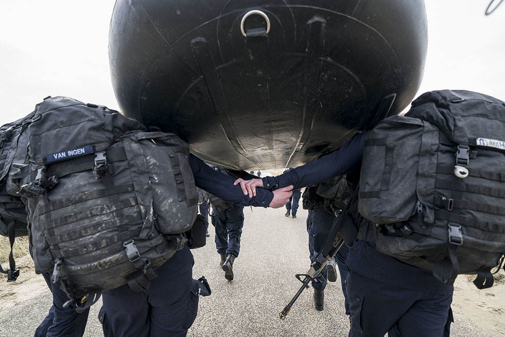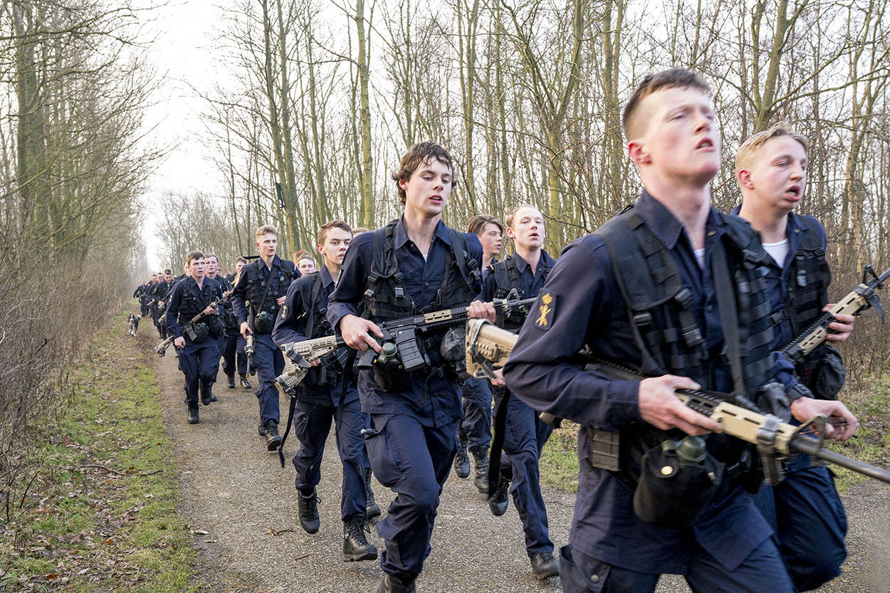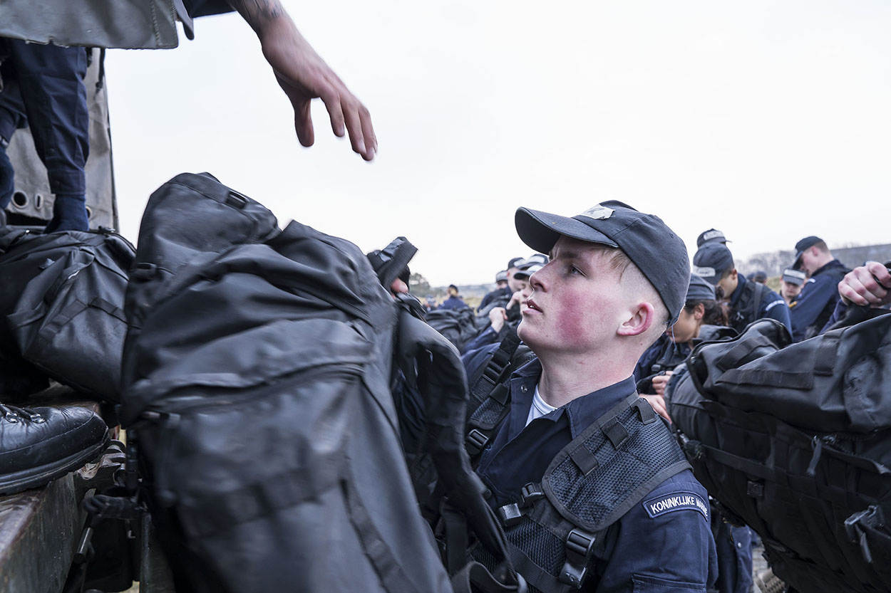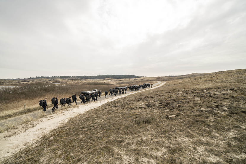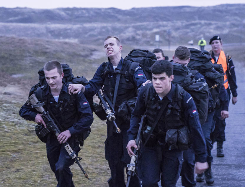 “Aansluiten!”, schreeuwt één van de baksmeesters. Al hinkend en strompelend probeert de achterste groep naar voren te komen. “Niet opgeven nu!”, wordt er vanuit de voorste linie bemoedigend geroepen. Het kader kijkt tevreden toe. Deze Volharding telt slechts 1 uitvaller, over de gehele opleiding genomen waren dat er 8, waarvan 4 door een blessure. Een acceptabel aantal voor de leiding. “Het is altijd de vraag of ze het allemaal gaan redden bij de vloot”, aldus Van Rensch. “We willen ze niet veranderen. We maken matrozen van ze die onder wisselende omstandigheden kunnen werken en zich verantwoordelijk voelen voor hun handelen.”