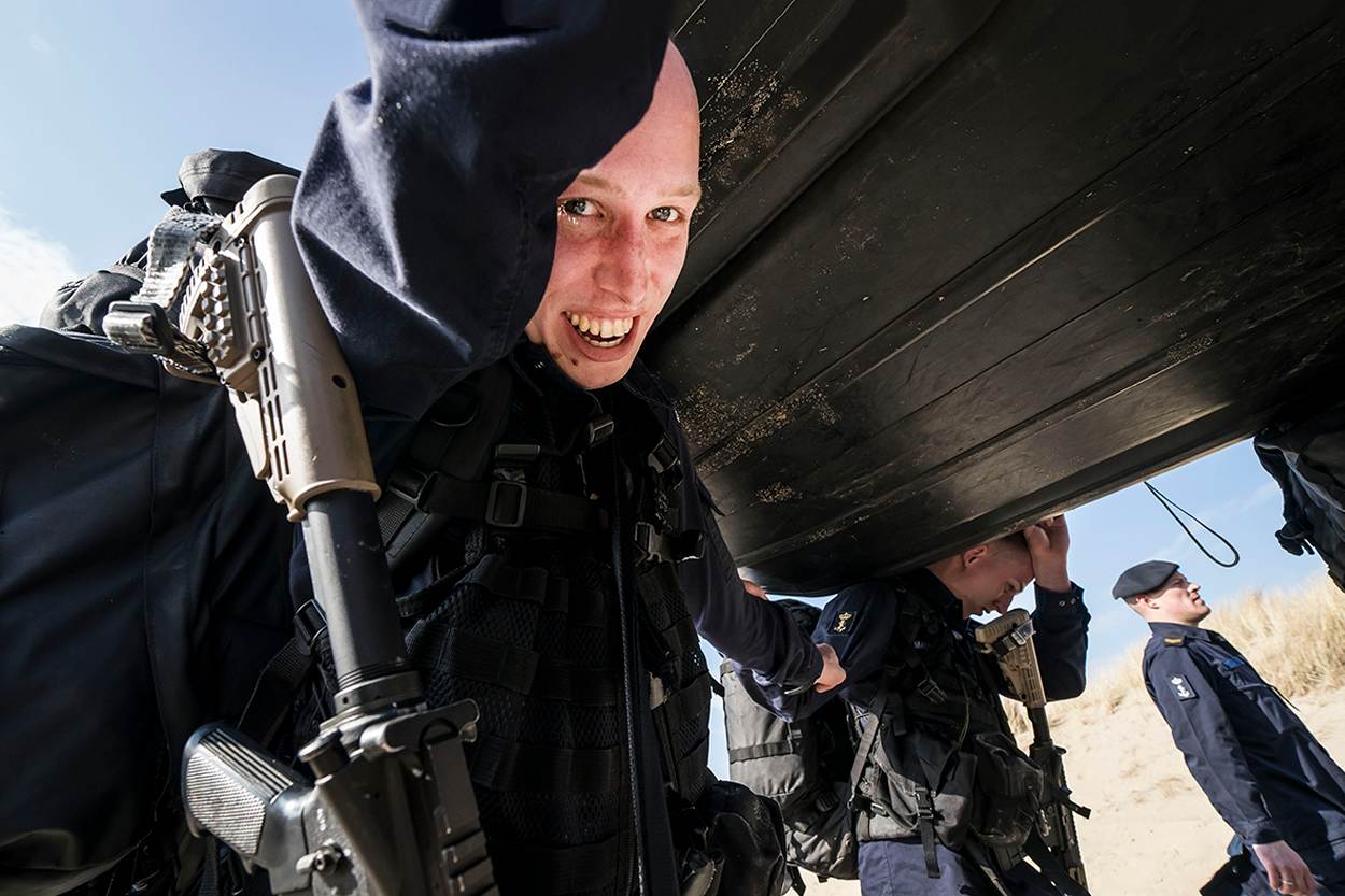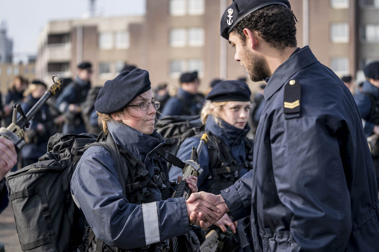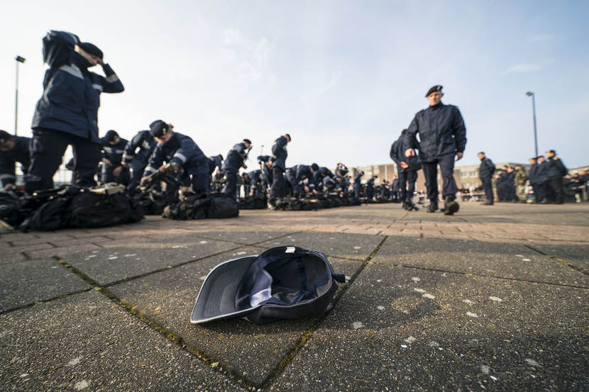 De laatste kilometers zijn ingegaan. De kazerne is in zicht. De zon probeert voorzichtig door de wolken te komen. Een symbolisch teken? Voor enkelen, die heel diep zijn gegaan vandaag, waarschijnlijk wel. Zij lopen bijna letterlijk op hun tandvlees, maar zo trots als een pauw de historische Keelpoort van Marinekazerne Erfprins binnen. Enthousiast onthaald door collega’s en geliefden. De volharding zit erop, de EMMV is afgerond. “Petten af, baretten op!” Een laatste bevel dat de nieuwbakken matrozen met alle liefde uitvoeren.