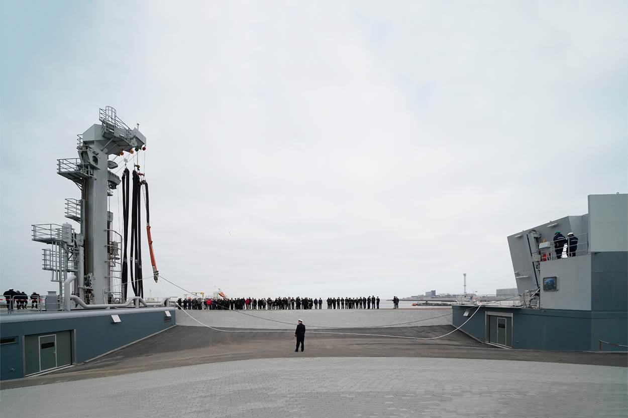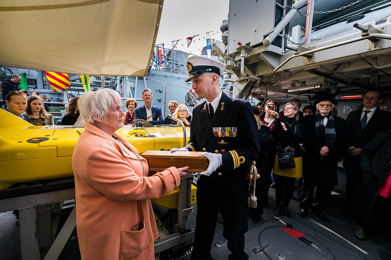 Zr. Ms. Vlaardingen heeft een nieuwe beschermvrouwe. Tijdens een speciale ceremonie werd Olga de Boer-de Snaijer op 11 maart in Amsterdam geïnstalleerd, 30 jaar nadat haar moeder het schip in 1988 doopte. Die mocht dat doen vanwege haar verzetsdaden tijdens de Tweede Wereldoorlog. Rechts: LTZ 1 Jur van Kasteren, commandant Zr. Ms. Vlaardingen (Foto: Paul Tolenaar)