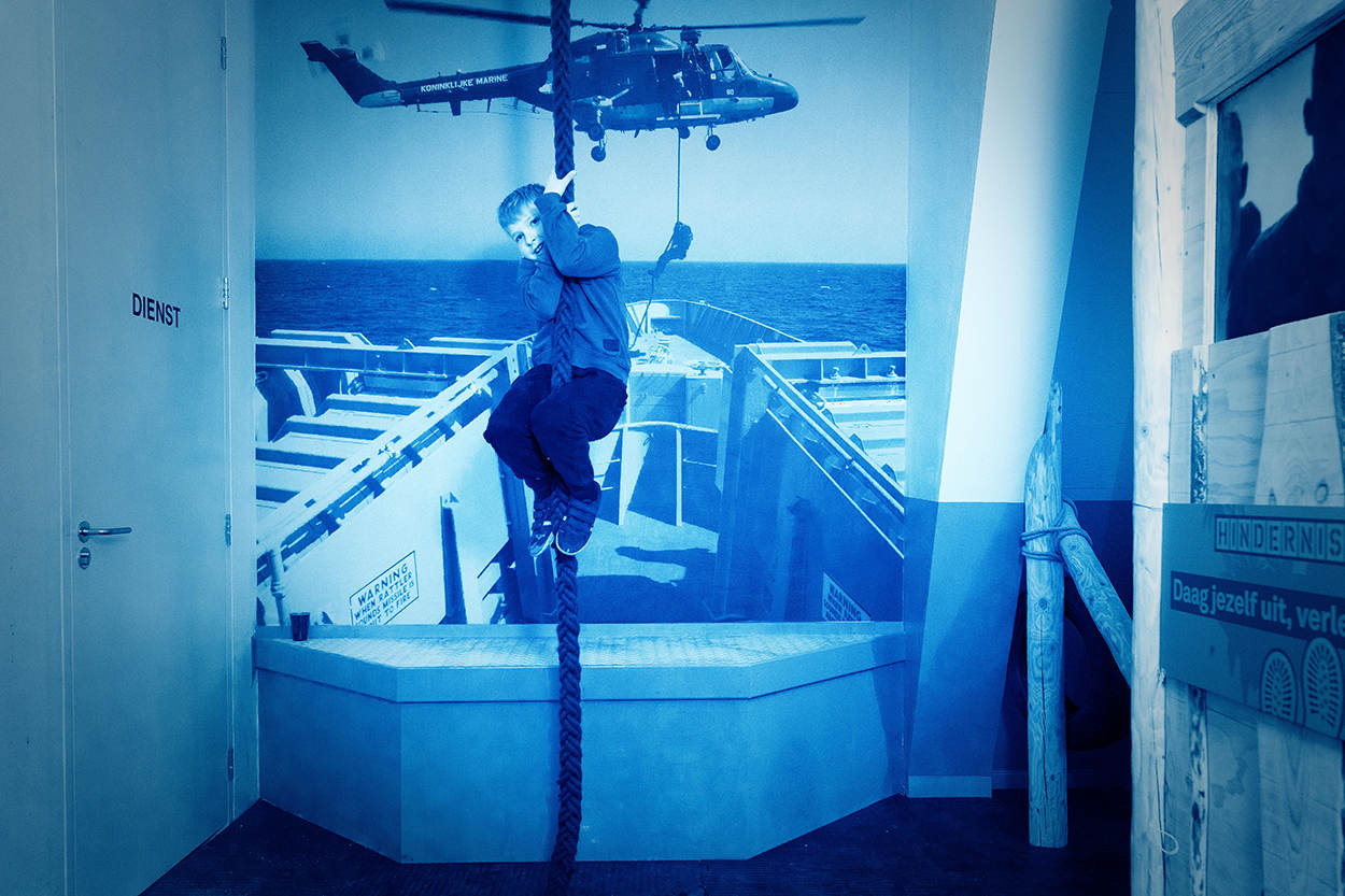Meer collectiestukken, meer wapens en vooral meer te doen. De vaste opstelling van het Mariniersmuseum in Rotterdam is helemaal vernieuwd. Het museum luisterde voor de herinrichting goed naar de wensen van de bezoekers. Kinderen kunnen een hindernisbaan op of in de touwen hangen, om te voelen hoe het is om marinier te zijn. (Foto: Louis Meulstee)